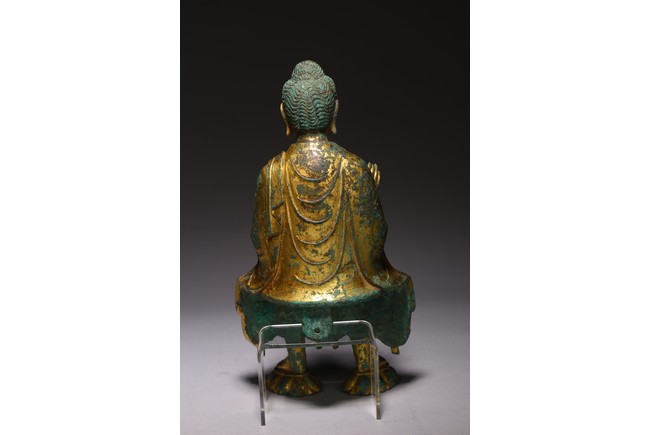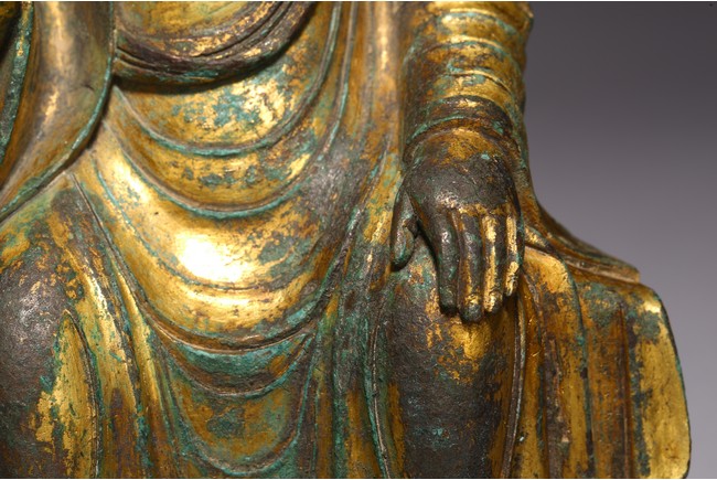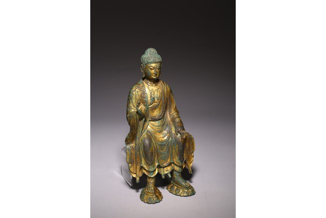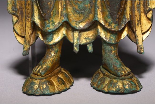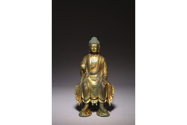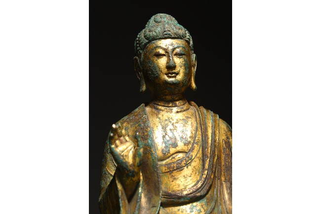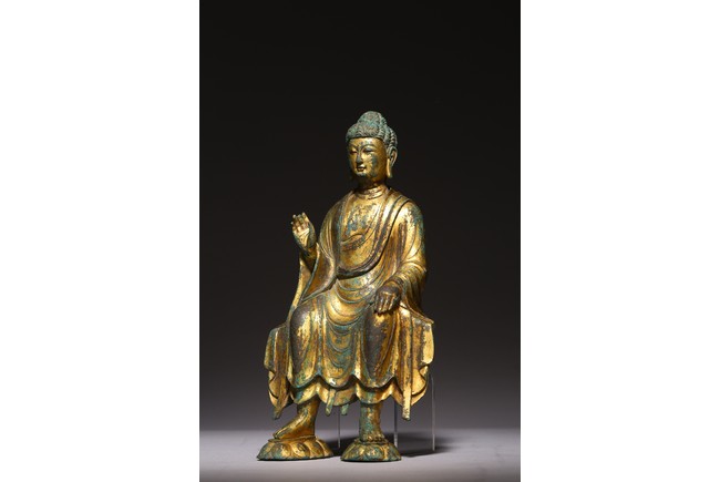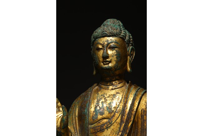 The figure with right hand raised in the vitarka mudra, surmounted by a high rounded ushnisha above pendulous earlobes, the face with arched brows, shown in a serene expression, the robe open revealing an inner garment, and draped towards the right side in soft folds, both feet rested upon two lotus bases. Tang Dynasty period.