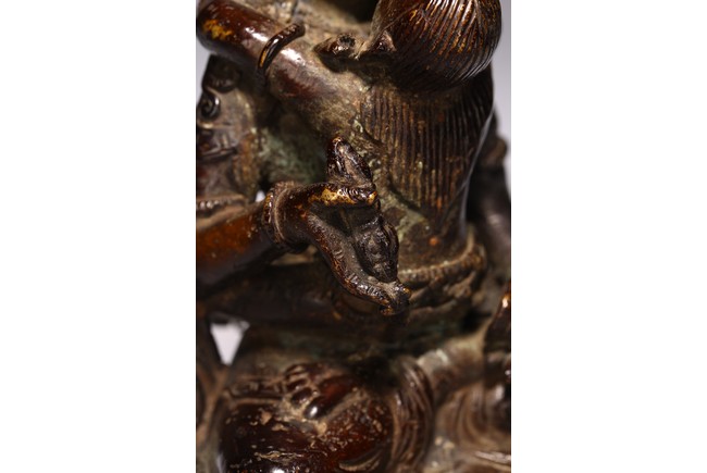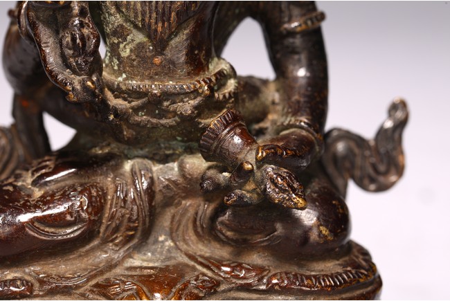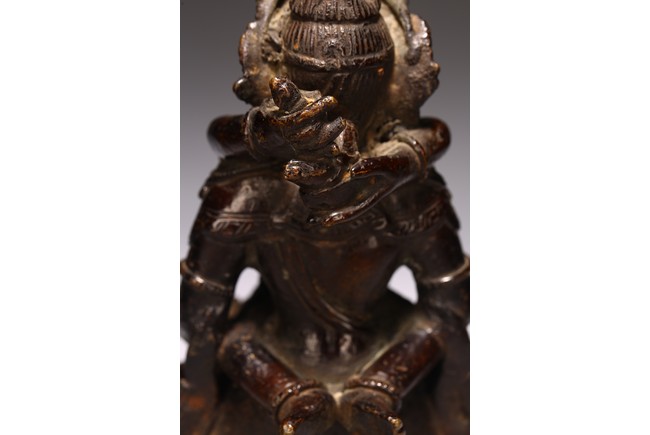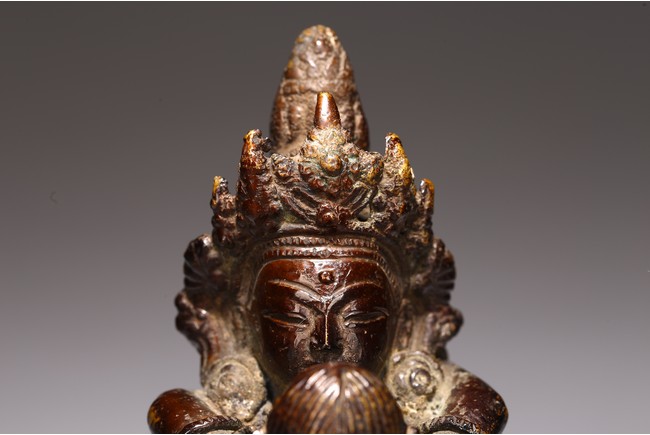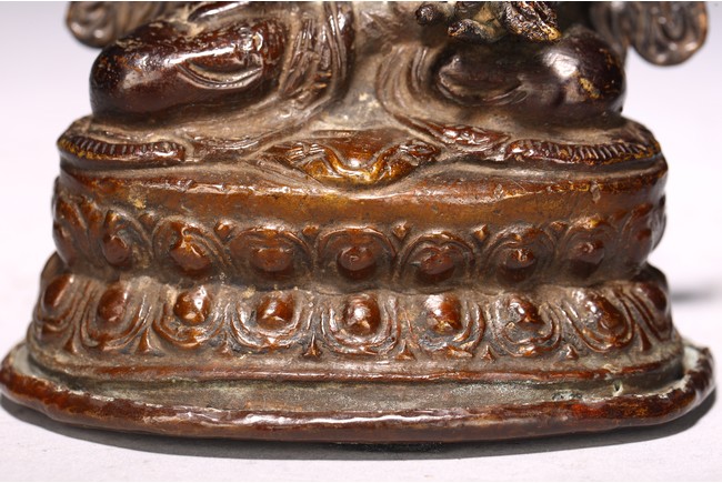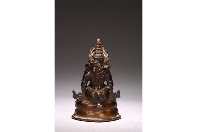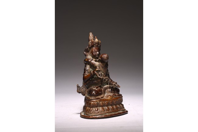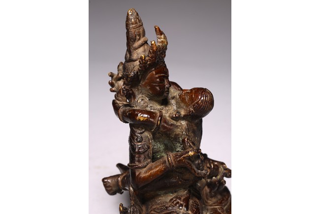 Cast seated in dhyanasana upon a double lotus pedestal base with in union with his consort, hands holding vajras, his face with gentle smile and framed by a high five-pointed crown. 18th century.