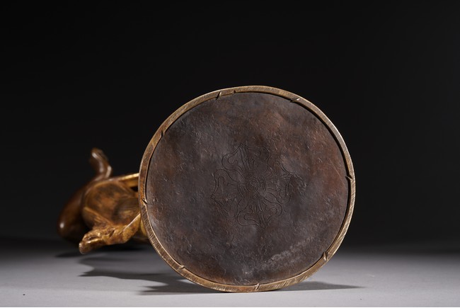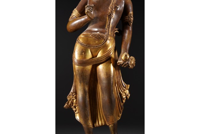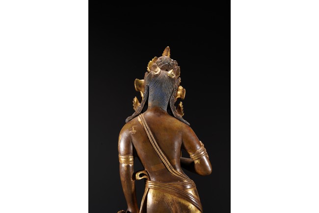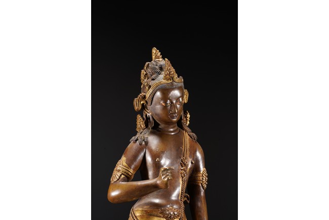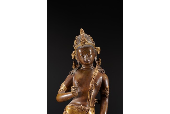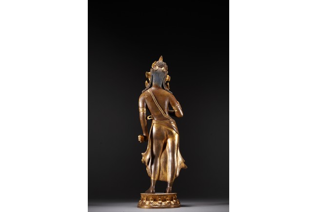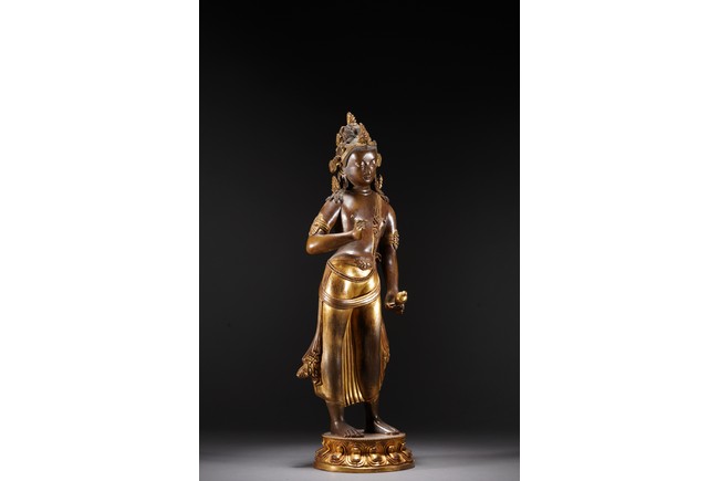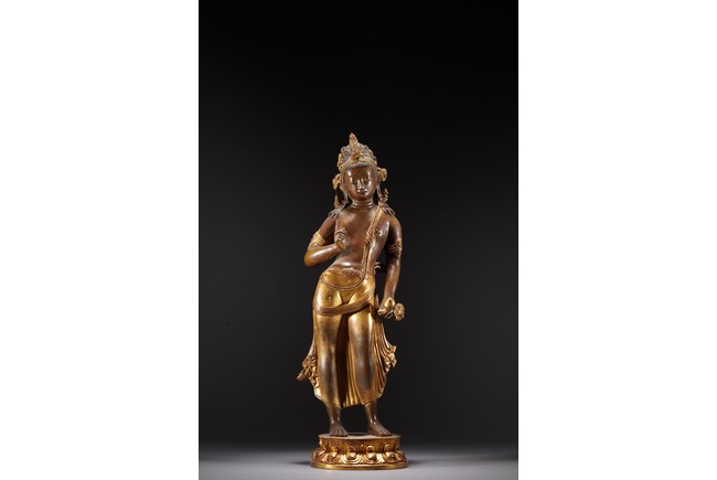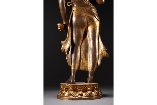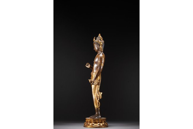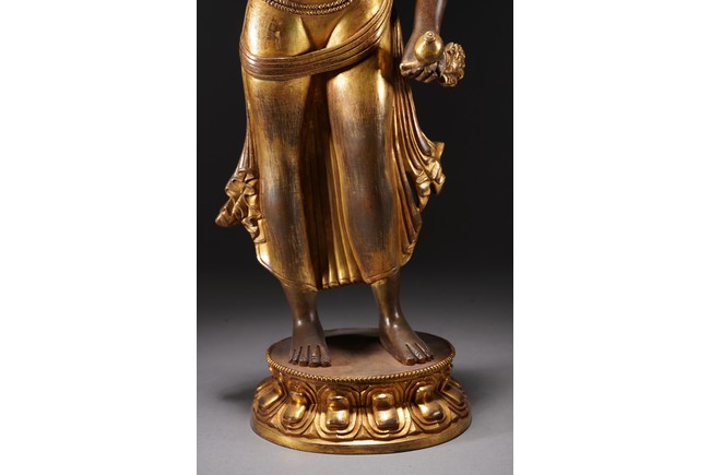 黃銅鎏金,頭戴花冠,兩側有扇形冠結,耳垂圓璫,髪髻高聳,作結的層次感較強,餘髪披肩。面龐飽滿,兩頤豐潤,彎眉與鼻樑相連,目光下斂,嘴角略露微笑,形像生動,現和煦慈悲之態,表面打磨十分光滑。上身袒露,寬肩束腰豐臀,體態圓渾,身軀呈三折枝式微微左傾,體態婀娜多姿,頸前飾瓔珞,長鏈披搭左肩而下掛身前,加強身體弧曲的視覺效果。加上面露含蓄寧靜的表情,自然優雅。