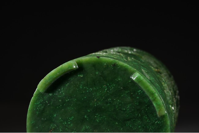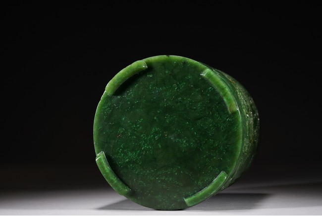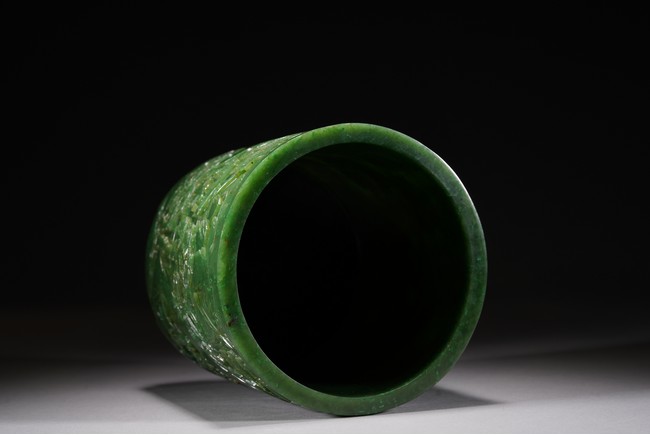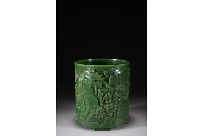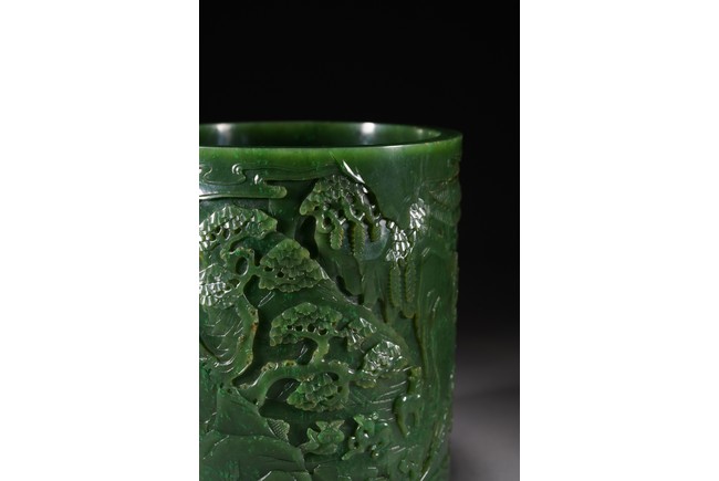 Provenance: From a private New York City collection 碧玉自古以來就被視為奇珍,此件作品用大塊優質玉料,故能製作大型筆筒,此件清乾隆碧玉山水人物筆筒,玉色幽深濃粹,隱現翠斑。筒身雕“三星”圖,寓意福壽吉祥,山林中,祥雲繚繞,山間茂林修竹,草木蔥蘢,意境清幽出塵。雕工極精,峻利深刻,章法有度,應出自宮中高手玉匠之手。 來源:紐約市重要私人藏家提供