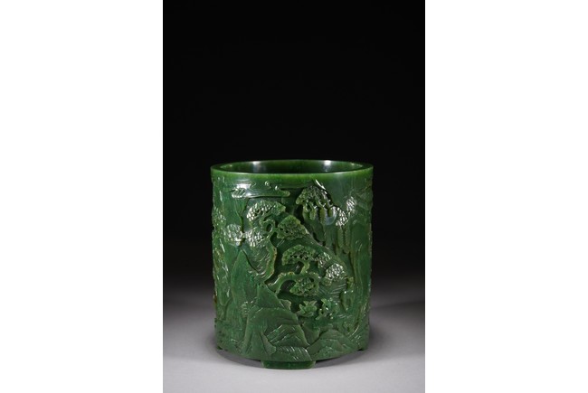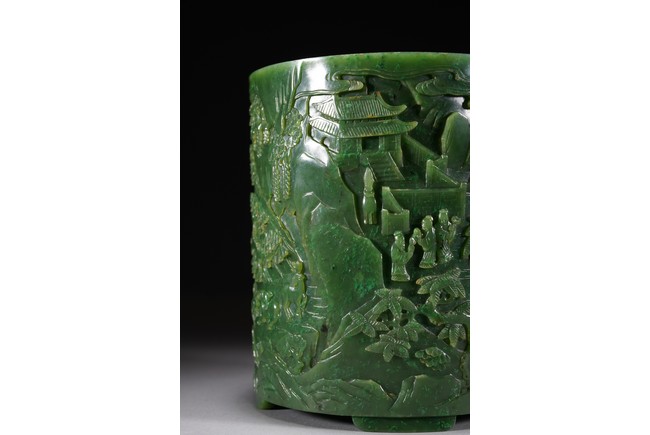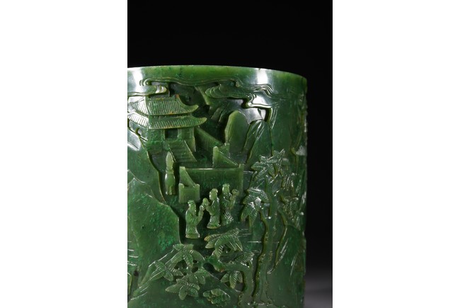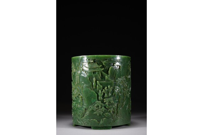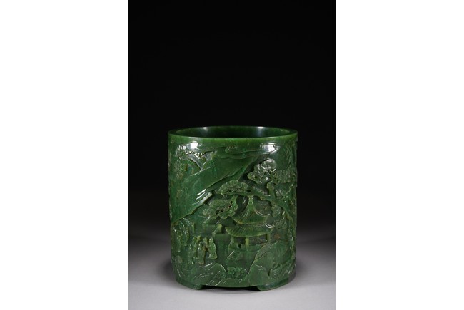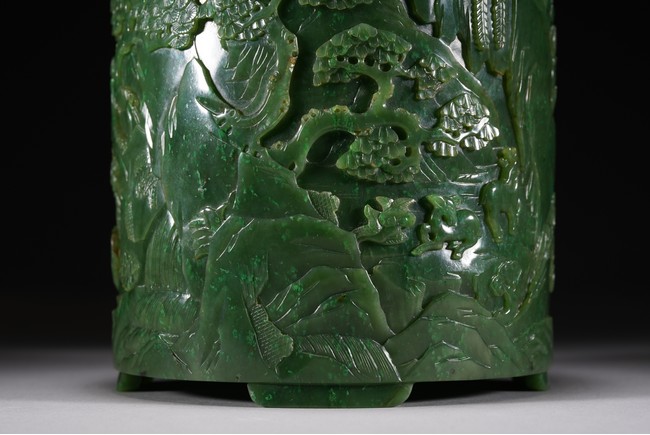Of cylindrical form, the brushpot supported on four short feet, the sides deftly carved in relief with scholars in mountain retreat surrounded by rocky peaks, waterfalls, pines, pavilions, the stone a deep spinach-green color variegated with lighter green inclusions. Qing Dynasty period.
