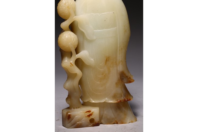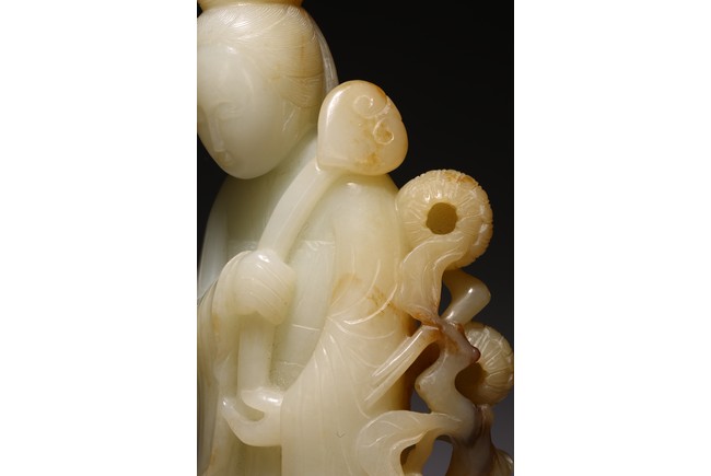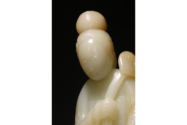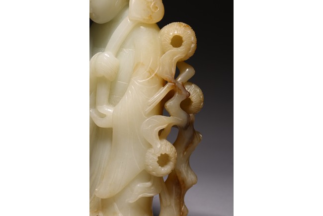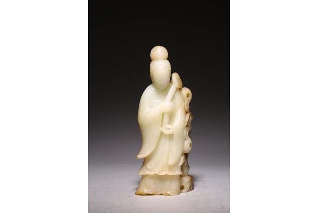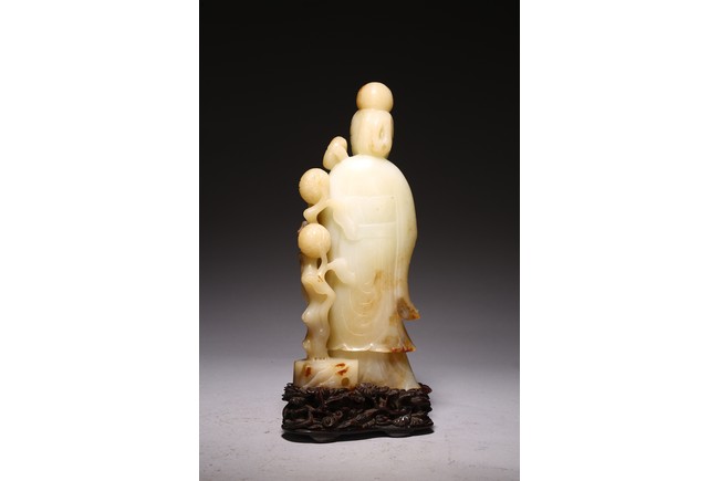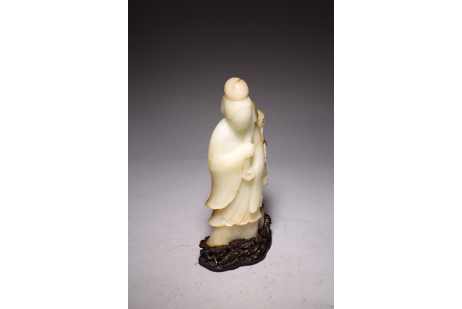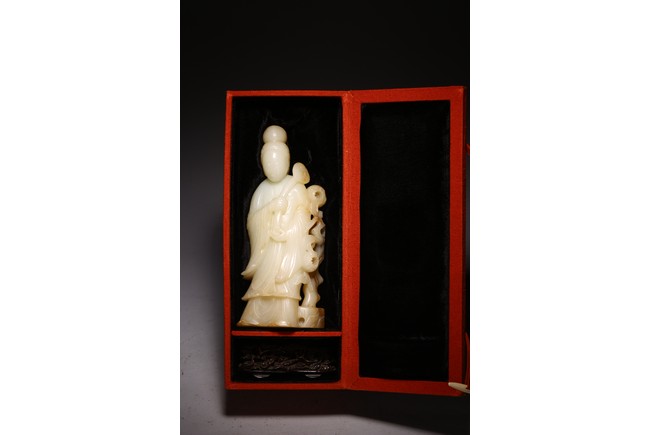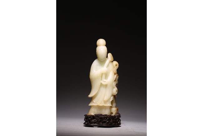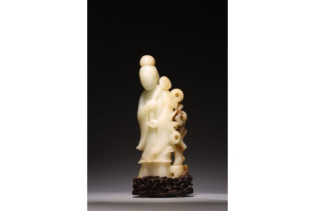Provenance: From a private Los Angeles collection 玉質潔白細膩,瑩潤光潔,採用圓雕技法,侍女高束髮,面容飽滿,長眉細眼,鼻樑堅挺,脣線分明,身着長袍,衣紋自然流動,雙手仟細,持如意。整體造型端莊,面帶微笑,神情自然。帶木座。 來源: 洛杉磯私人藏家收藏