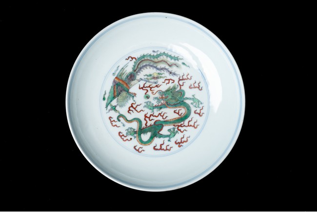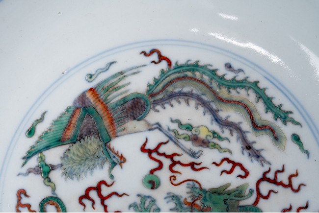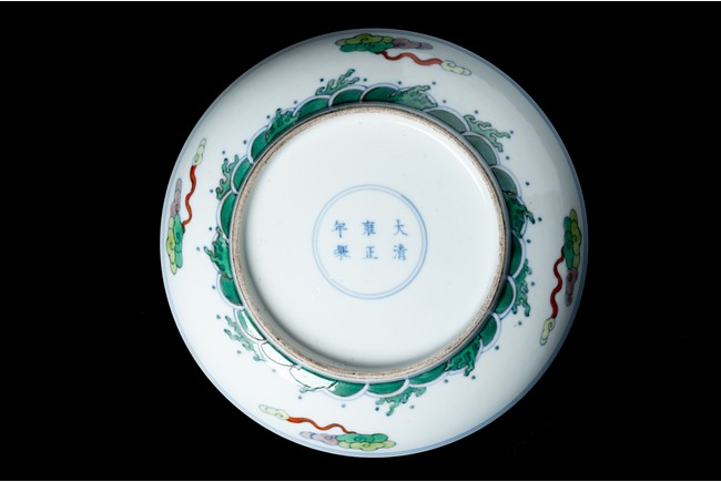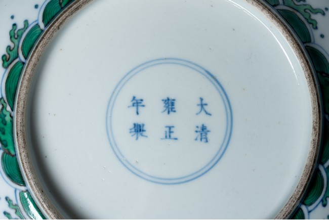 The center painted with a dragon and phoenix confronted on a flaming pearl amid multi-colored auspicious clouds, enclosed by double ring borders, the exterior decorated with clouds above crashing water, base inscribed with six character Yongzheng mark. Qing Dynasty period.