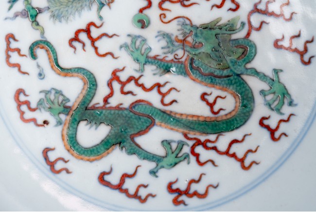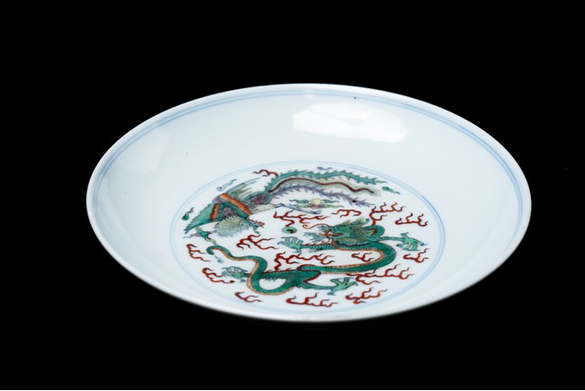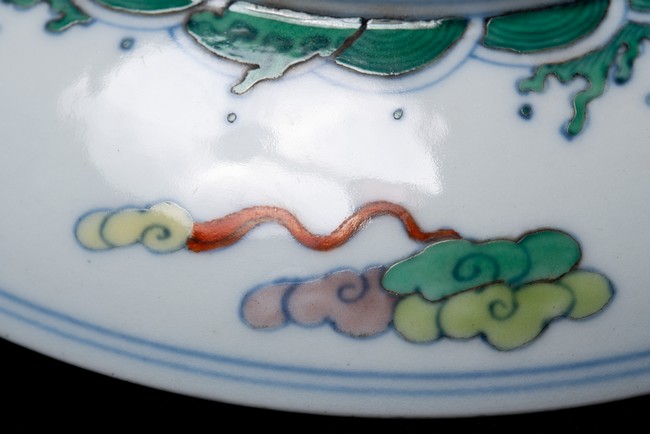 敞口,弧壁,圈足,造型俊美,胎質細膩,白釉瑩亮,釉色淡雅,釉上用「黃」「綠」「紅」諸彩描繪「龍鳳紋」,龍鳳上下相望,形象生動,活靈活現。整器畫工精細,色澤鮮亮,形制規整。「大清雍正年制」款識。