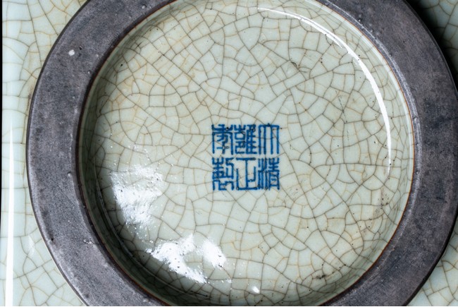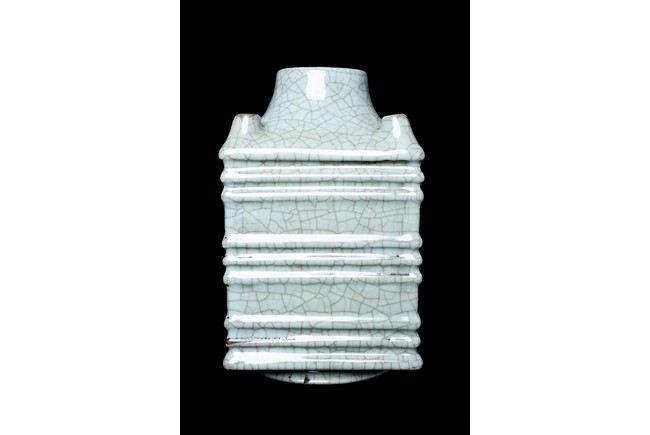 五孔瓶器形创烧于雍正官窑,乾隆以后不见。除仿哥釉外,还见有青釉品种。此瓶造型敦实沉稳,胎体厚重,上部折肩五孔的设计颇为别致,中间开一大孔,四角环绕四小孔,孔与器身相通,于稳重中透出灵动,瓶身凸出三组弦纹,令整体造型更富变化的韵律。通体施仿哥釉,釉质肥润,布满不规则细密开片,釉色恬淡素净,再现哥窑之釉色恬淡素净,极为古雅。“大清雍正年制”款识。