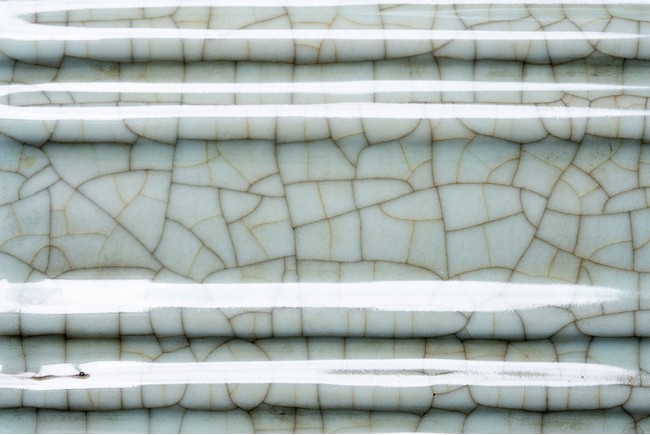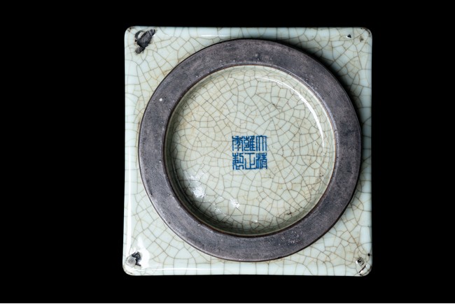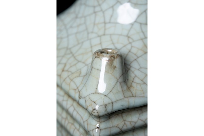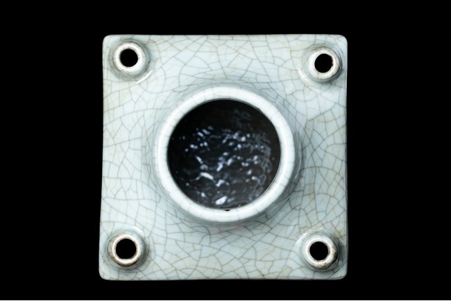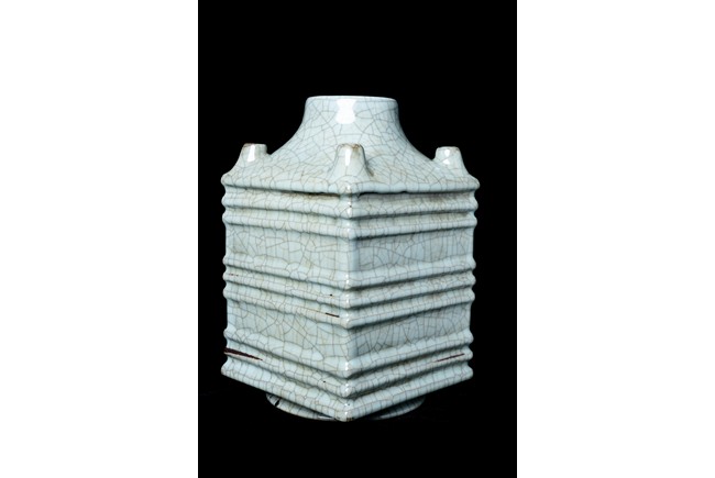 Of square section, body with seven string bands, rising to four smaller spouts at each corner around the canted shoulder rising to the short neck, overall covered with a greyish glaze suffused with a dense network of ‘iron-wire', base inscribed with Yongzheng mark. Qing Dynasty period.