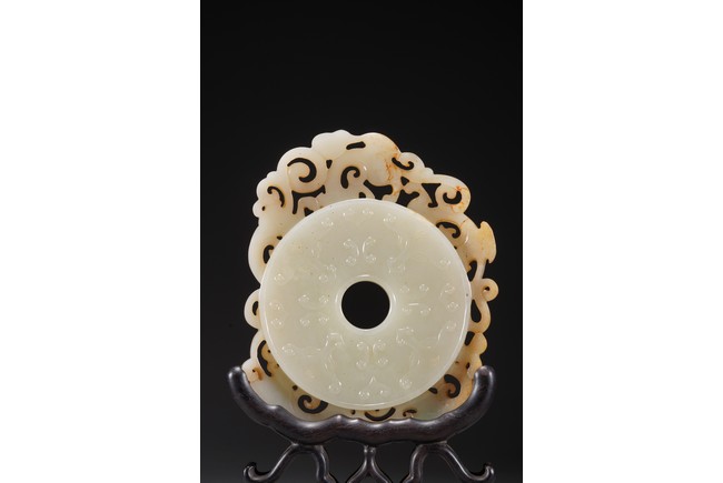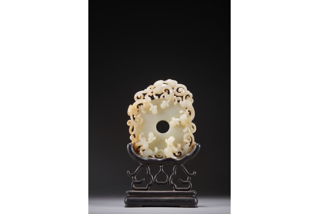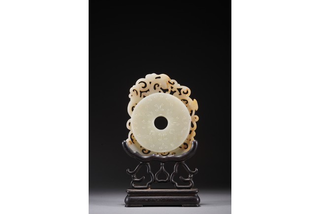 玉璧為整塊新疆和田玉籽料雕琢而成,用料碩大,料質潤澤,正面圓雕鏤雕五條螭龍,盤旋其間,氣勢恢宏,背面滿繪簡易如意紋,簡潔古樸,原配紅木隨型底座,整體造型挺拔脫俗。