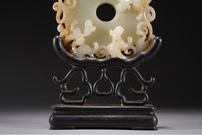 Worked in high relief on one side with five chilong clambering sinuously, the reverse decorated in low relief with scrolled ruyi motifs, supported on hardwood stand.