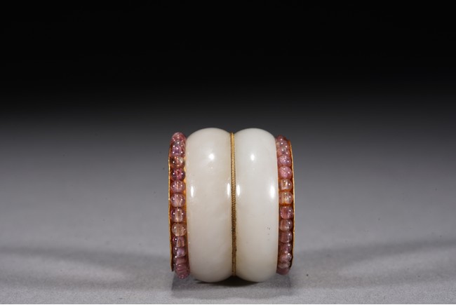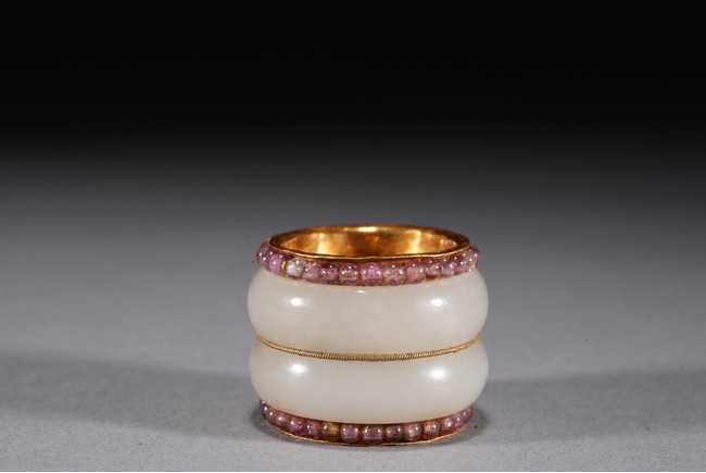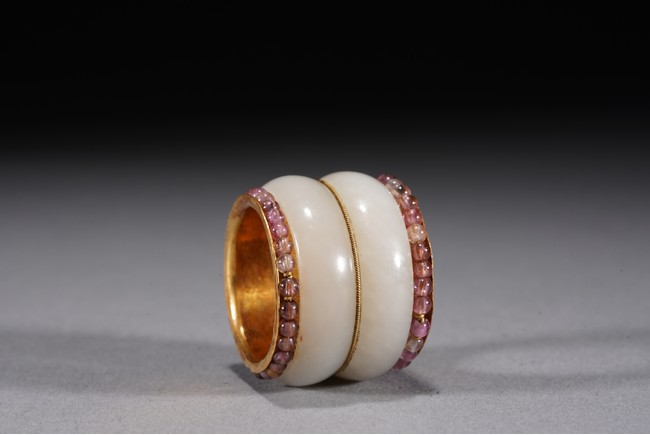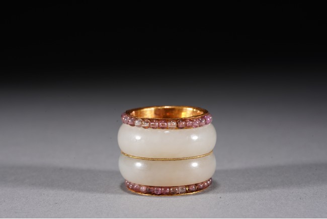 清宮廷風格白玉嵌純金戒指,外壁雙環和田白玉指環,玉質溫潤牙白,內鑲嵌純金環,多年摩挲包漿紅亮,難得完整御製賞玩佳品。