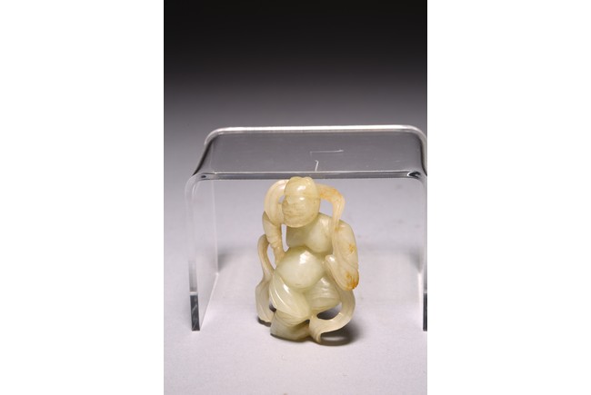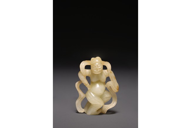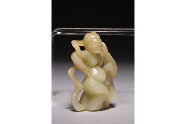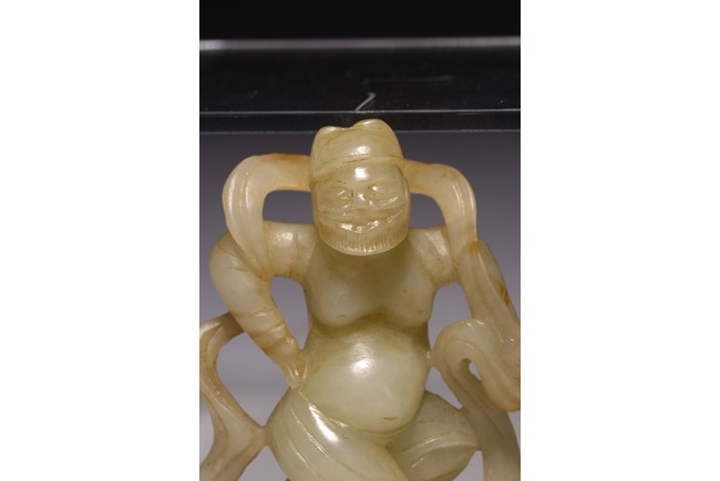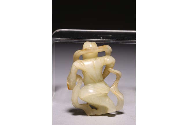 The dancing beard figure carved wearing celestial ribbons across both shoulders and arms, revealing his bare belly and breasts, the stone is of white russet tone.
