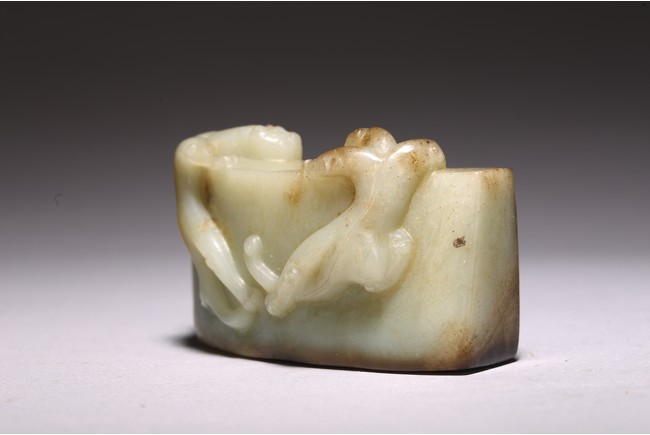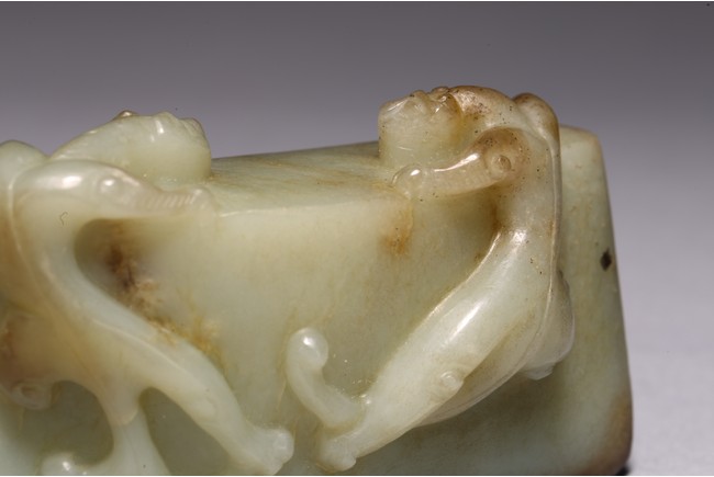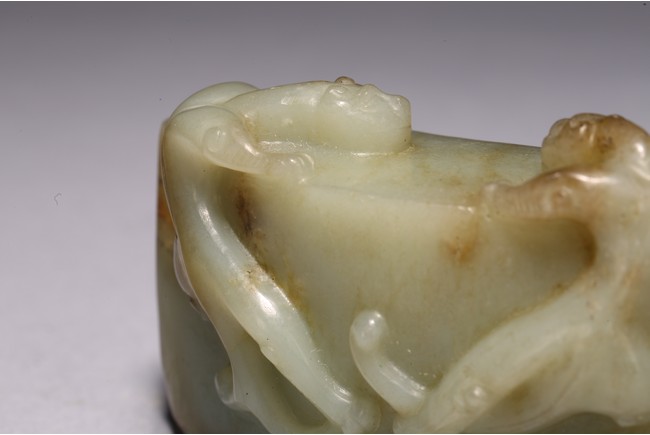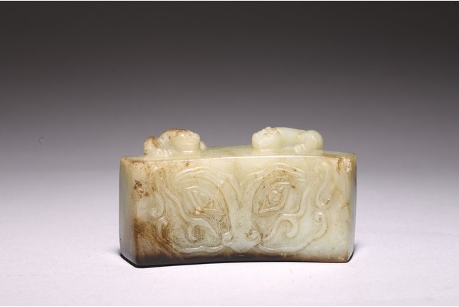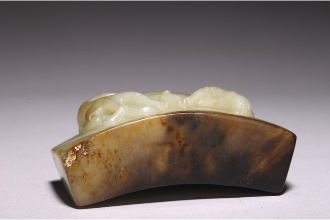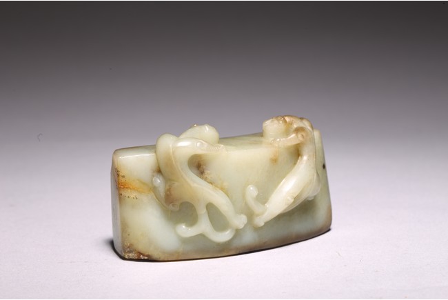 Chinese. Of arched form, carved with two clamerbing chilong on one side, the other side carved in shallow relief with a taotie mask. Qing Dynasty period.
