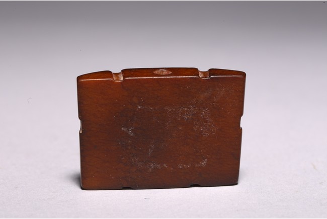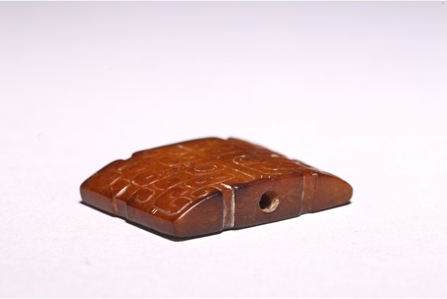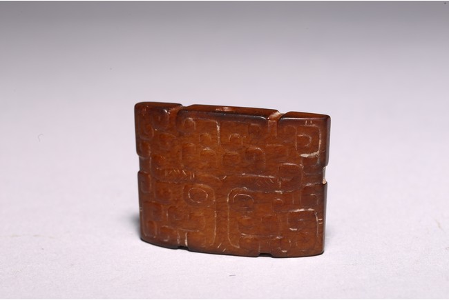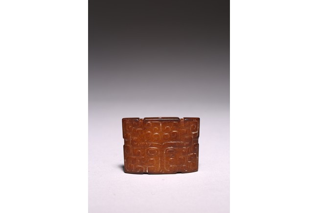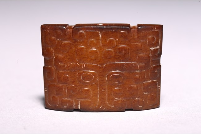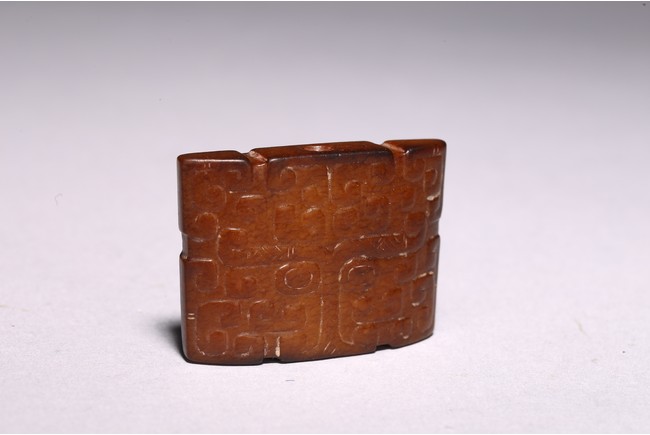 Chinese. Of trapezoid shape, the chape is carved on both sides with angular scrolls in the form of mythical beast 'taotie' mask, pierced through the center with holes on both top and bottom. Qing Dynasty period.