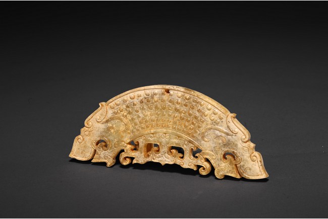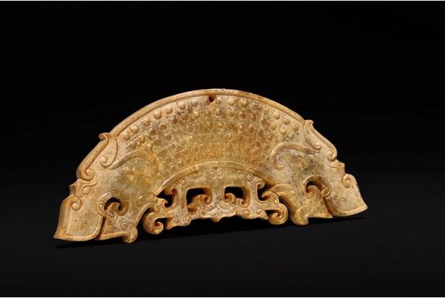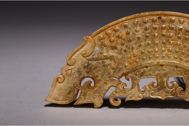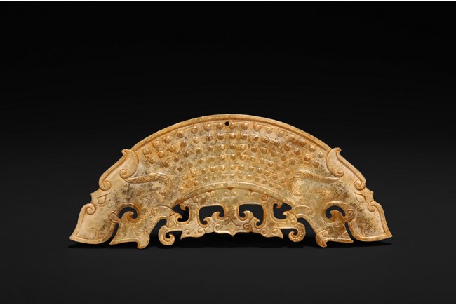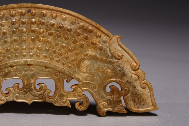 Chinese. The arc-shaped pendant is exquisitely carved with a dragon's head either end with their bodies intertwined, decorated comma spirals in low relief on both sides, and pierced with one suspension hole to the top. Possibly Warring State period.