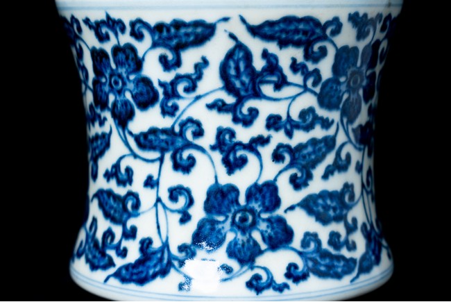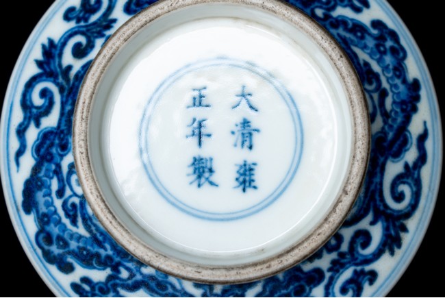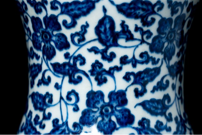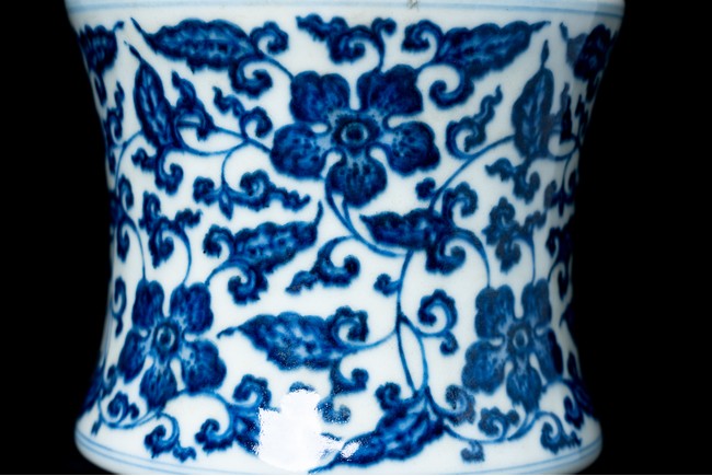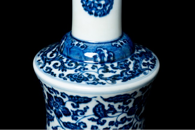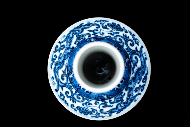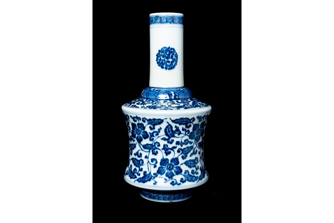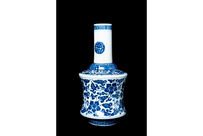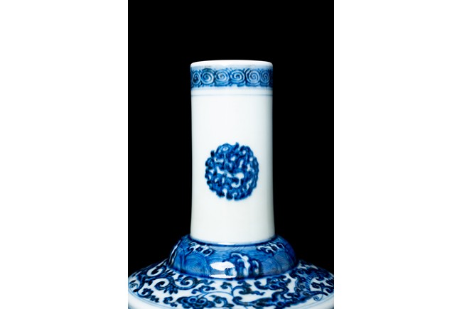 細長頸,盤肩,收腹,圈足。胎質堅硬,釉色潔白,肥厚瑩潤。通體施青花繪「捲雲紋」「夔龍紋」「海水紋」「纏枝花卉紋」,青花髮色明麗,色澤明亮,紋飾結構嚴謹,畫法細緻,精細秀麗,線條流暢。「大清雍正年制」款識。