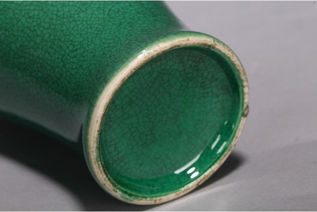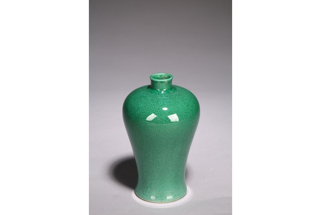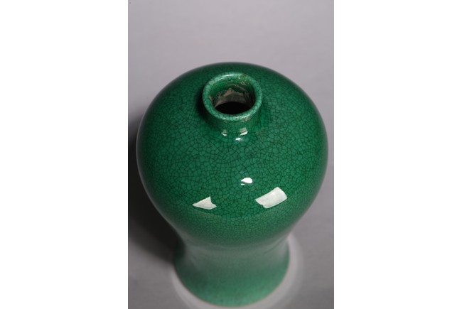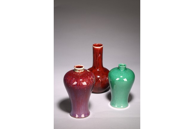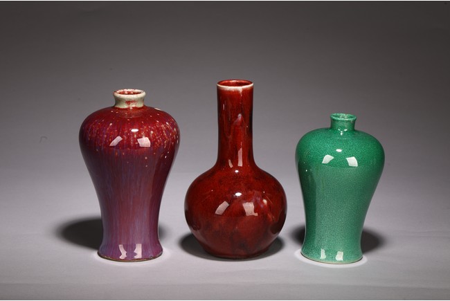 Consisting of three monochrome glazed vases, including a flambe glazed meiping vase; a green glazed meiping vase with crackled pattern; and globular formed vase with red glaze. Qing Dynasty period.