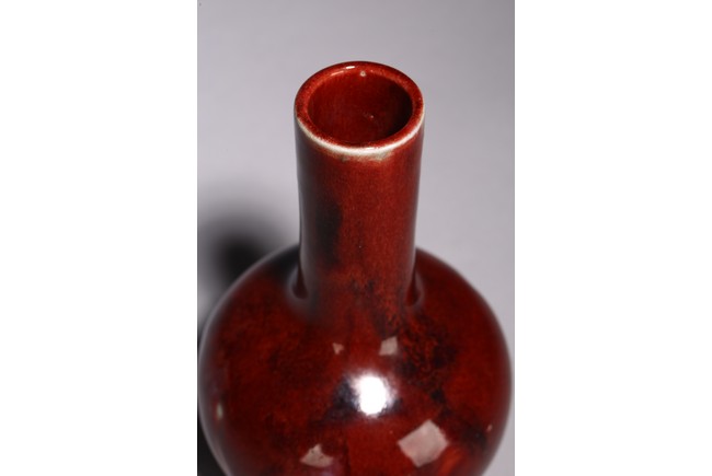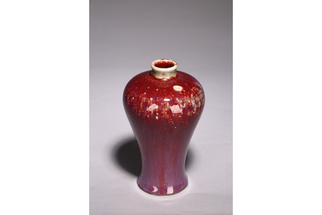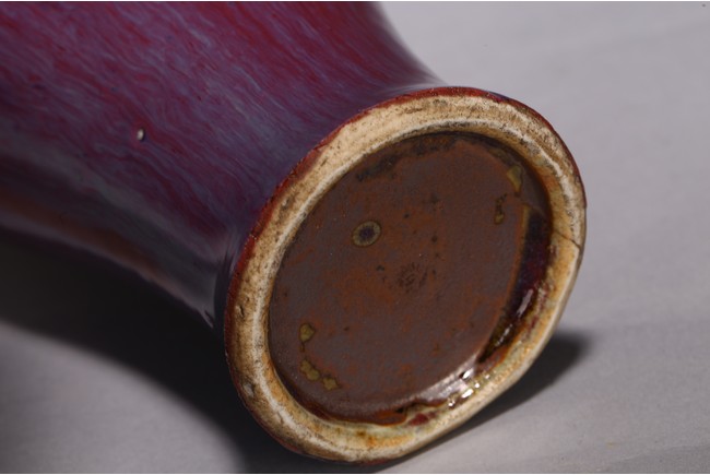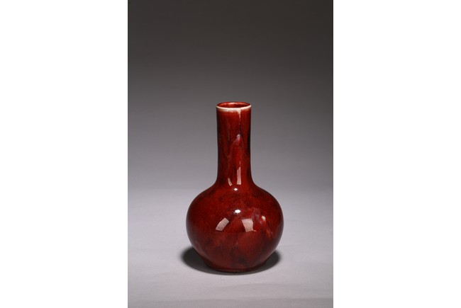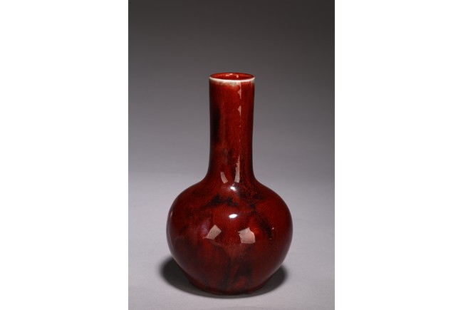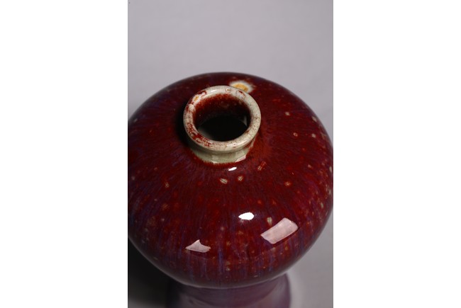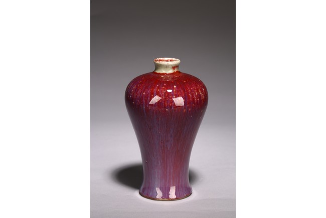 拍品依天球瓶之造型而作,通體施窯變釉,斑斕異常,巧奪天工。窯變梅瓶外形俊秀挺拔,線條優美流暢,予人高貴靜穆之美。其釉色月白、藍、紫與紅色交織在一起,形成了萬千變化、美麗異常的窯變釉,是清代宮廷精品佳作。