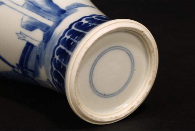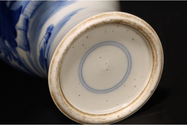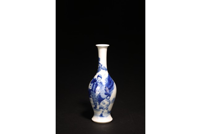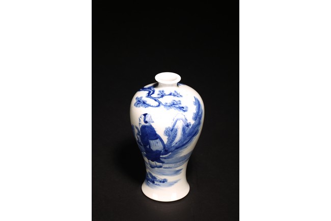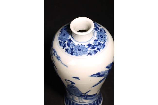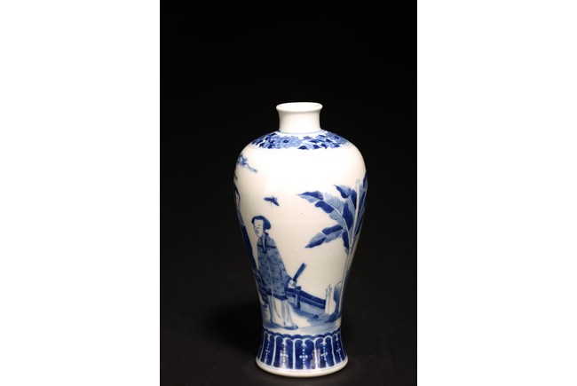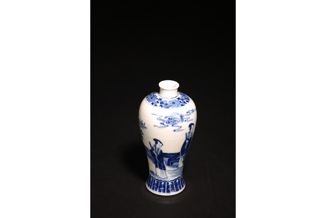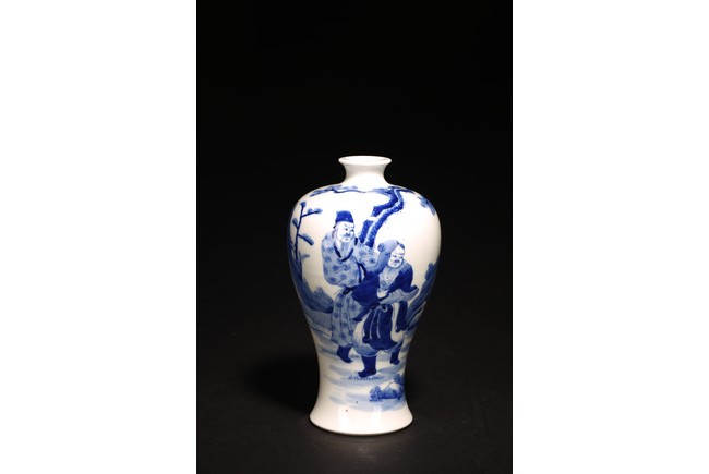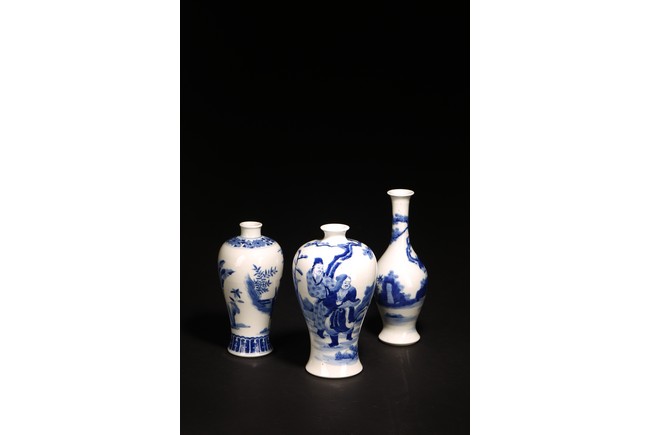 Consisting of three blue and white vases, one meiping form, body decorated with three figures; one decorated with lady figures in garden setting; one with long neck, body decorated with figure and horse. Qing Dynasty period.