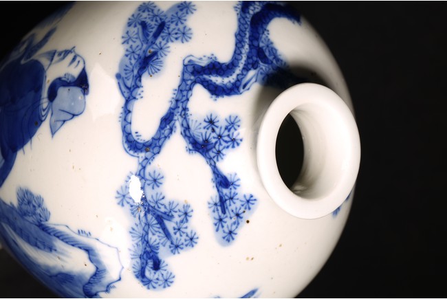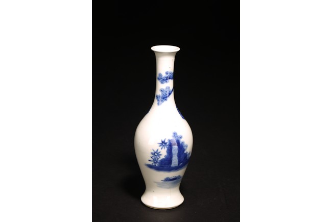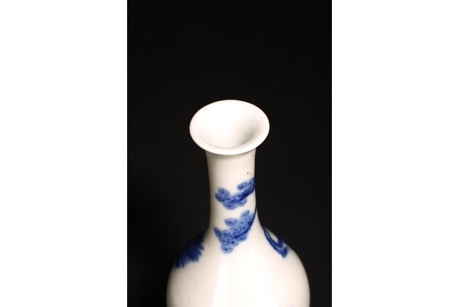 青花髮色舒雅,畫工細膩,胎質白皙,釉面潤澤,梅瓶端莊大氣,畫工精細,疏密得當。賞瓶撇口、長頸,鼓腹下收,圈足,青花髮色舒雅,畫工細膩,胎質白皙,釉面潤澤。