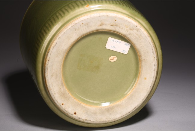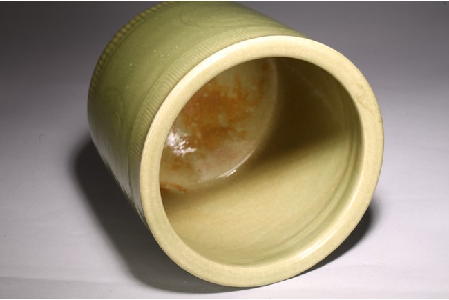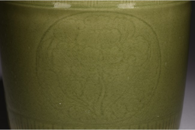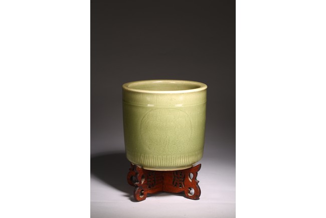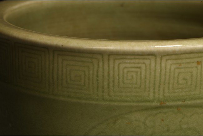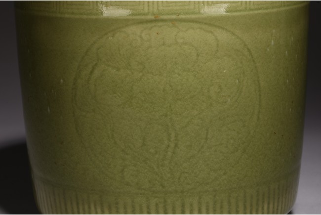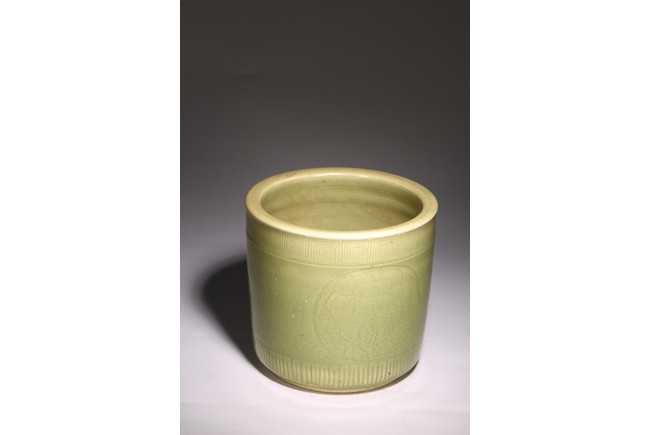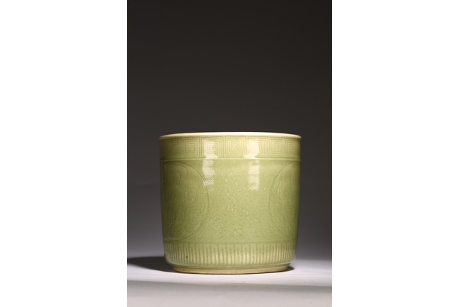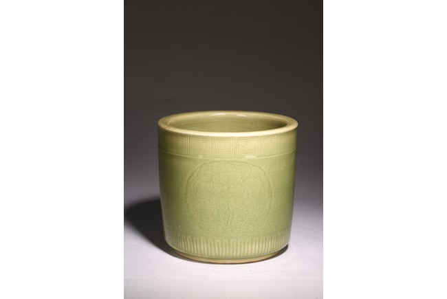 The exterior carved with two medallions enclosing a flower in between a key-fret band around the top and upright rectangular leaves around the bottom. The vessel is covered with an even celadon glaze. Yuan/Ming dynasty period.