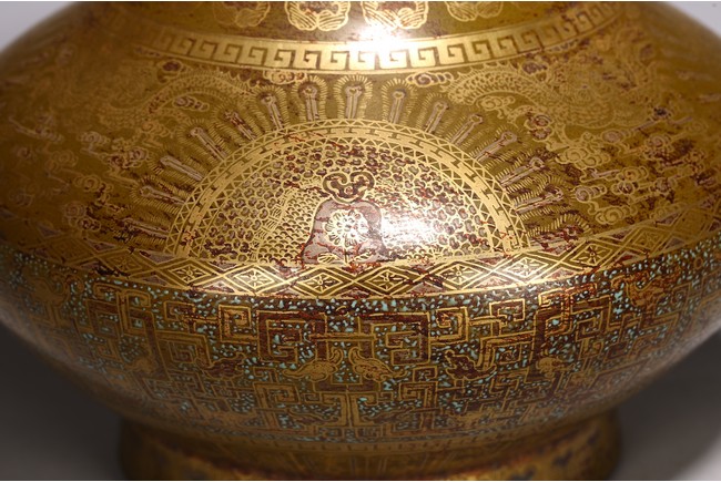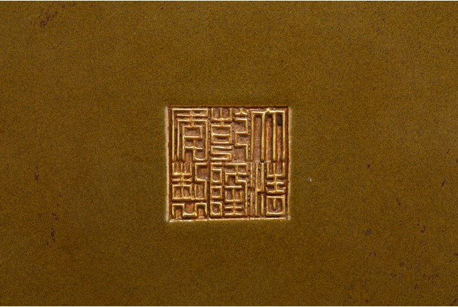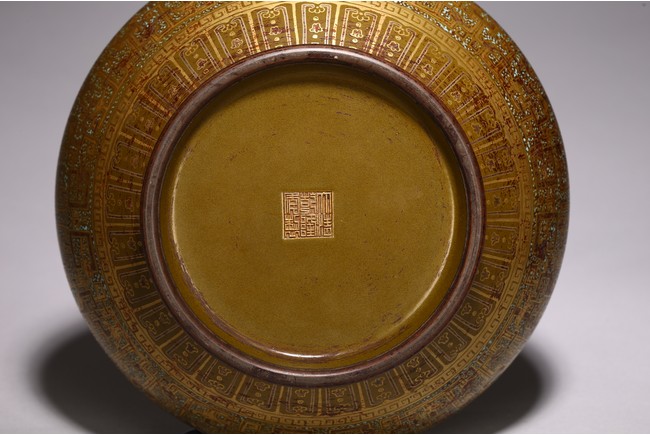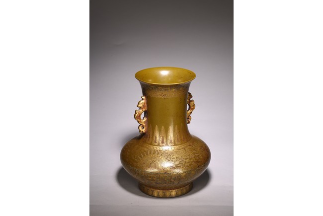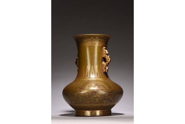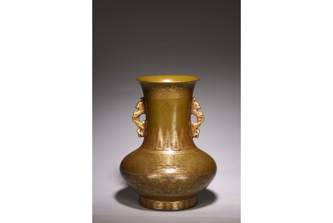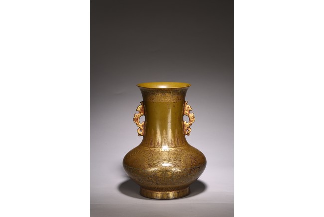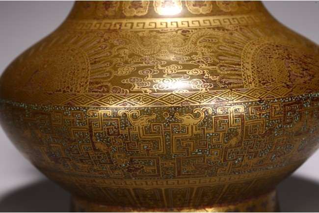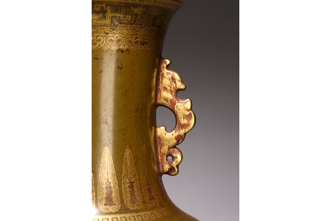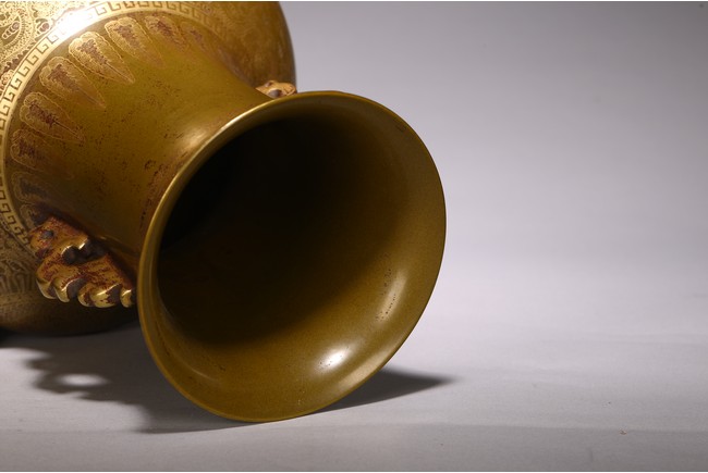 The body painted in gilt with band of keyfret and angular dragon pattern, neck with a band of upright plantain leaves flanked by pair of handles, base inscribed with six character Qianlong mark, overall covered with olive-brown color picked out with a fine yellow mist.