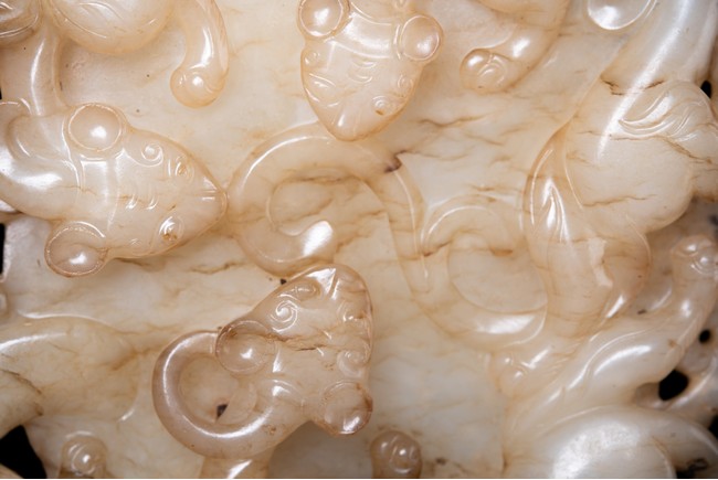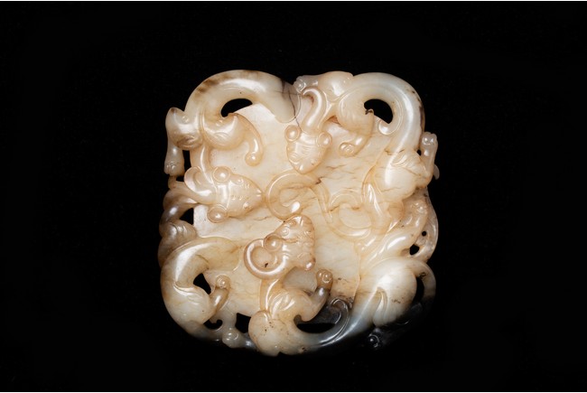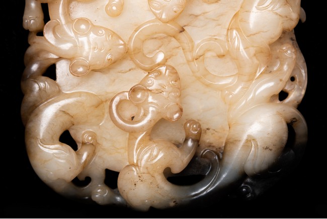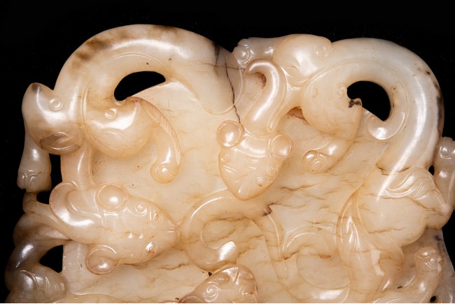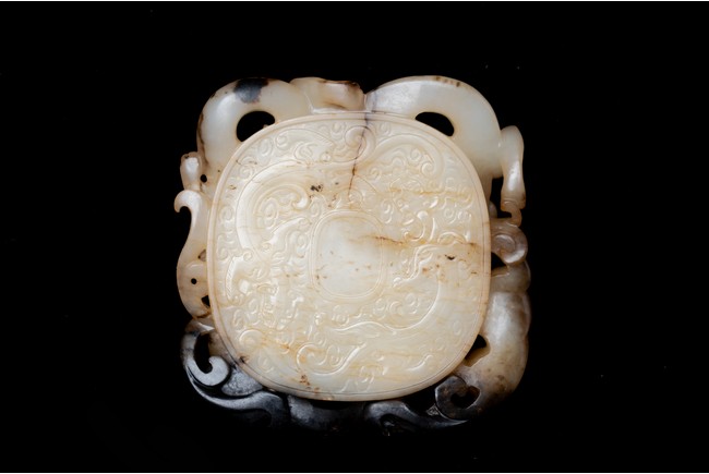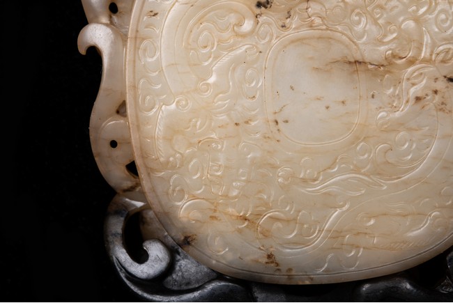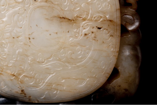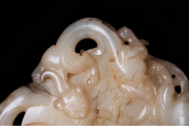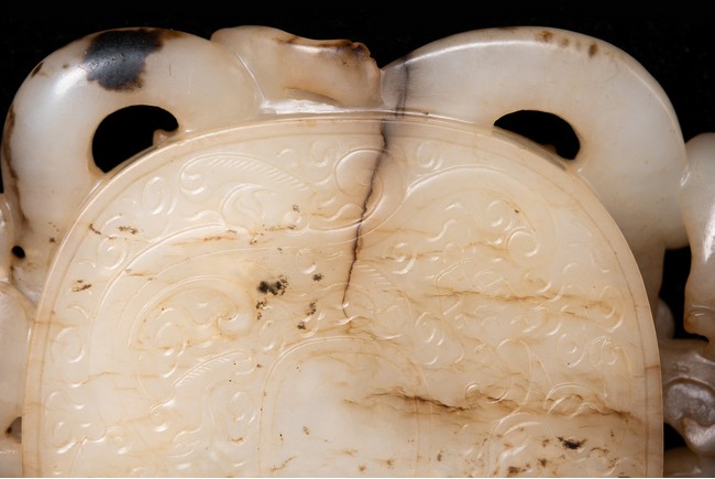 Of circular form, the disc carved in the form of three sinuous chilong in high relief in circle; the reverse further carved in shallow relief with two encircling chilong amidst cloud scrolls. The stone is of white to russet tone with black inclusions and veinings. Qing Dynasty period.