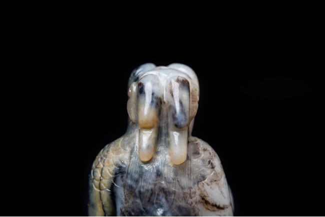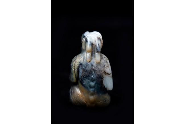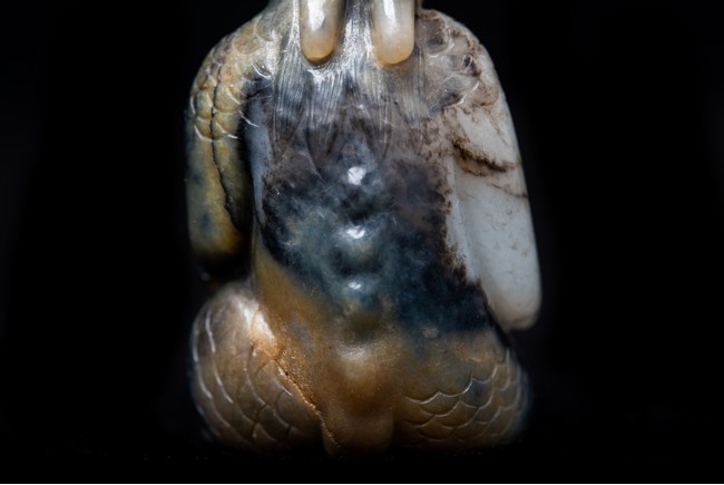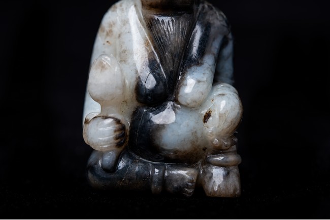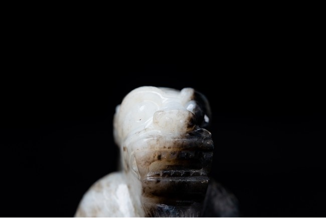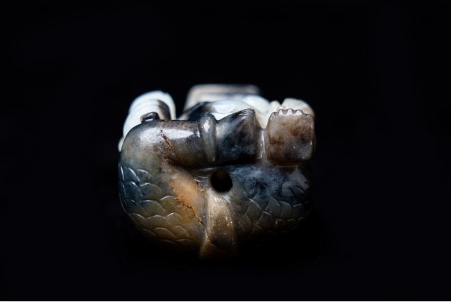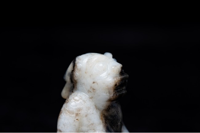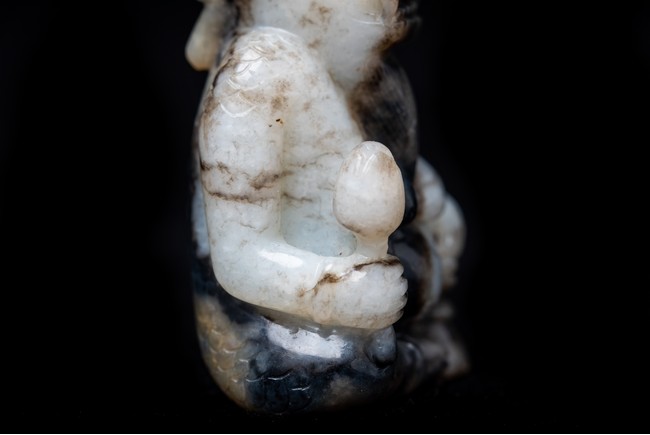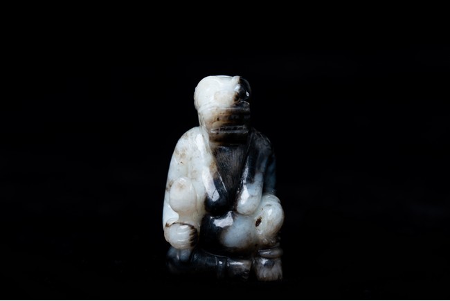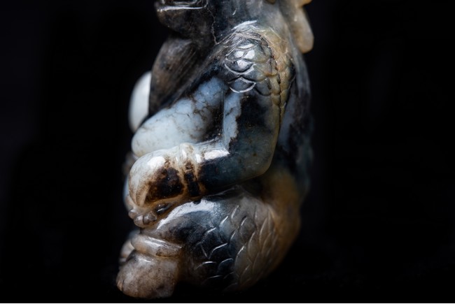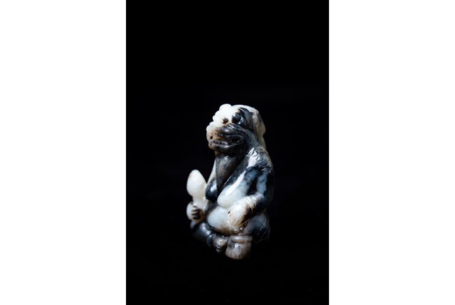黑白玉製成,層次分明,玉質溫潤細膩,包漿純熟。此龍神爲十二生肖組飾之一,作龍首人形,形體小巧,昂首望天,雙目圓瞪,闊鼻,張牙咧嘴,神情威武霸氣,身上麟甲刻畫清晰,層次分明,左手持法器,右手扶膝,盤腿端坐,整體造型古樸,端莊靜穆。此物與故宮博物院的一組青白玉十二生肖擺件造型相似。