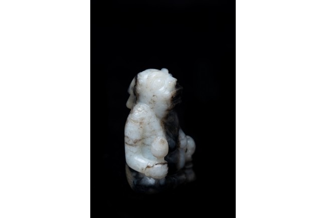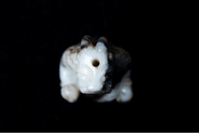 The black and white jade carved anthropomorphic animal figures of the zodiac dragon depicted seated with head looking straight, wearing long robes, right hand holding an attribute, a hole drilled through the top to bottom. Qing Dynasty period.