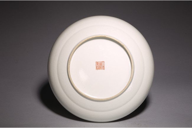 圓口,折腰,圈足。器身施粉彩繪人物,人物神態各異,神情生動,衣紋自然清晰。用墨彩書寫詩文,筆法老道,蒼穹有力