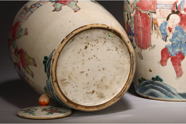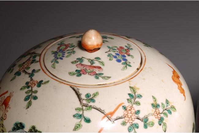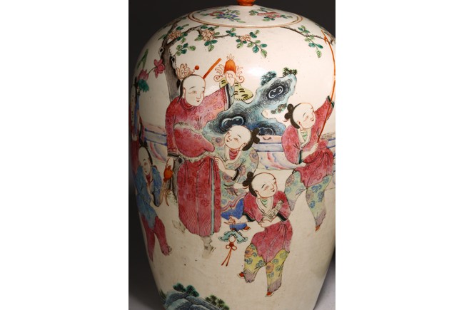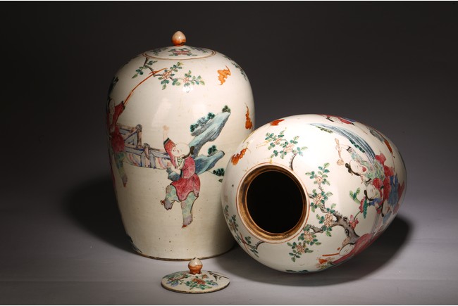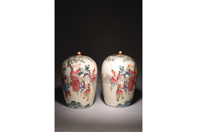 Each jar with ovoid body brightly enamelled around the exterior with boys playing in a garden setting, the shallow domed cover surmounted by a lotus bud finial. Qing Dynasty period.