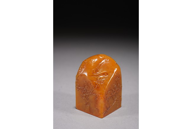 The warm yellowish-orange stone is of rectangular section with an irregular upper corner. The sides carved in shallow relief with landscape scene. The seal face inscribed with four characters. Republic period.