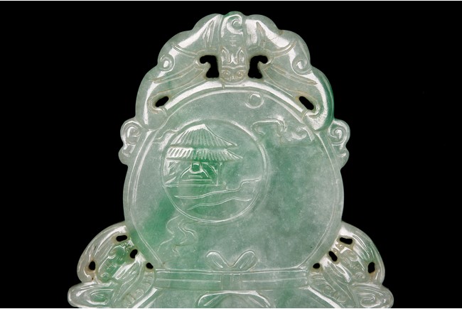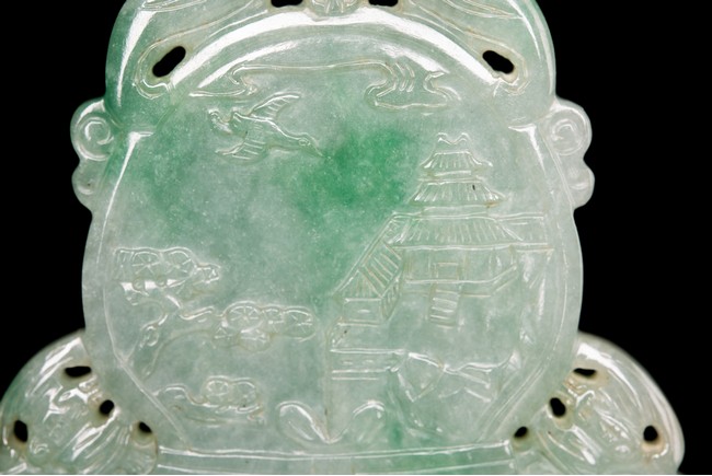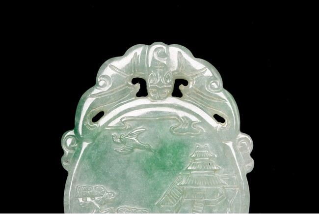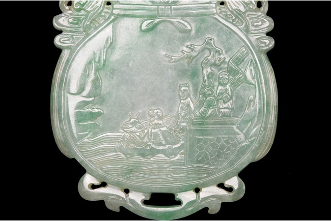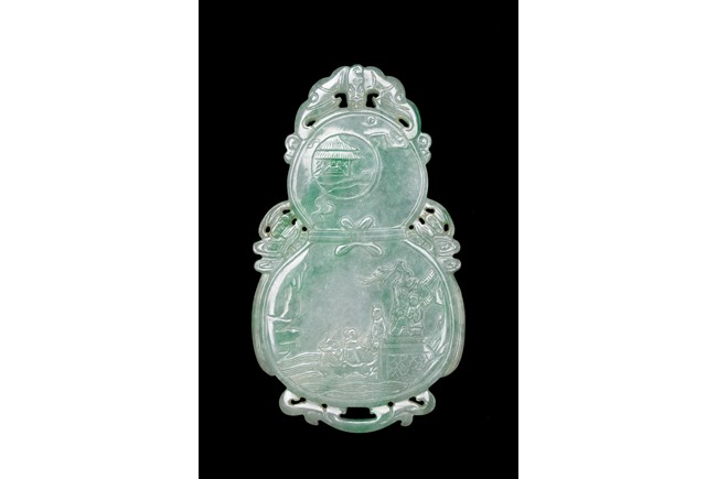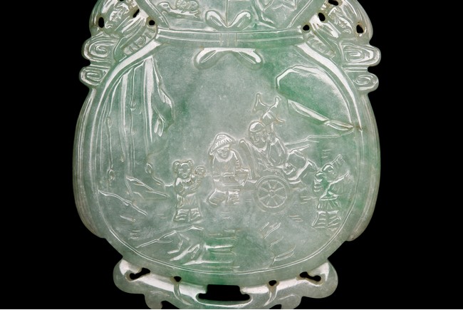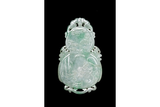 翡翠俗稱硬玉,主要產於緬甸,緬甸翡翠以其充滿生機的青翠與碧綠的特點開始受到皇家重視,迅速走進了王公貴族的審美視野。此牌濃豔深沉,水頭充足,種水皆佳,色澤通透,青綠宜人,玻璃光澤強,盡顯晶瑩剔透之感。牌呈葫蘆形,牌首雕飾「倒掛蝙蝠紋」,正面雕飾「雲鶴」「松樹」「亭屋」「松樹」「山石」,「老者」手持權杖,上系葫蘆,安坐於輪車上,「童子」喜笑顏開,跟隨其旁。反面雕飾「捲雲」「亭宇」「山石」「海水」,仙人坐於搓船上,童子含笑跟隨其旁。整體人物生動形象,五官刻畫清晰,細膩寫實,眉清目秀,面容安靜祥和。整器取材甚佳,雕工精湛,神韻十足,寓意美好,有「福祿壽」之意,適宜佩戴。