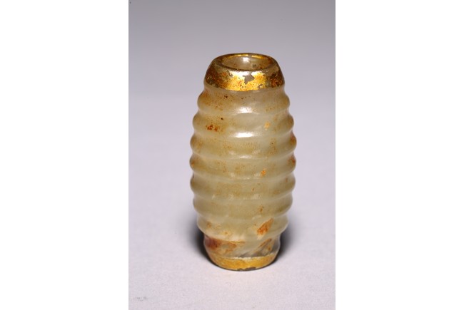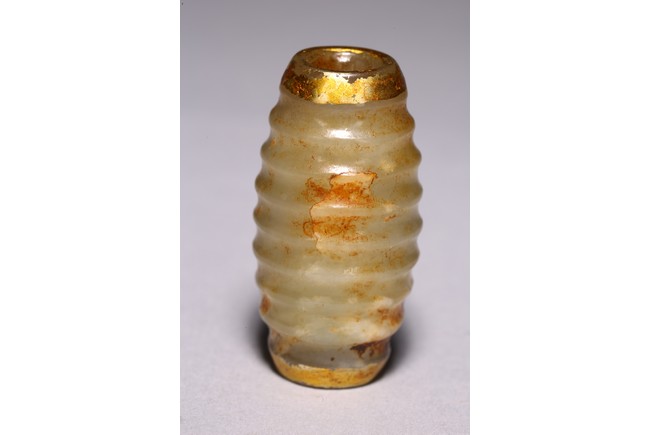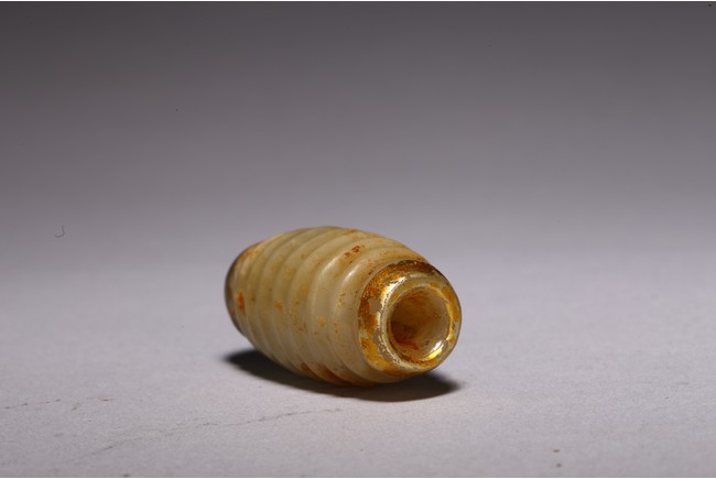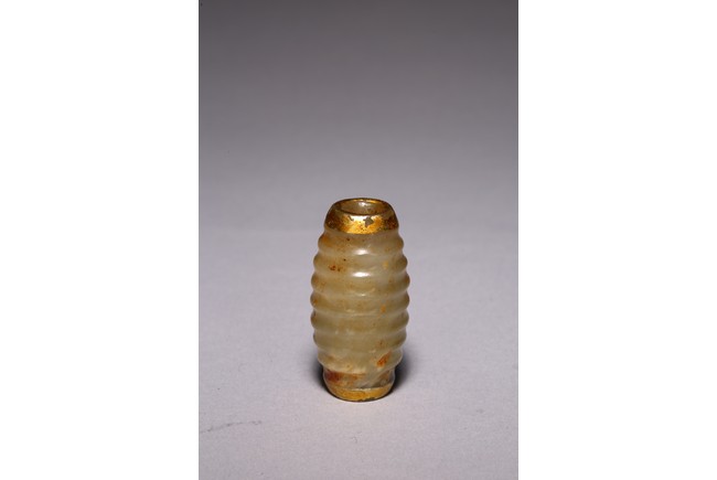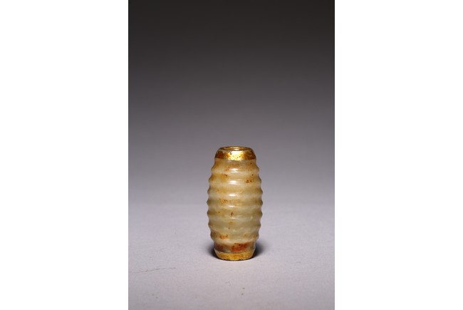 Of ovoid form, the jade bead with grooves decorations, both ends painted in gilt.