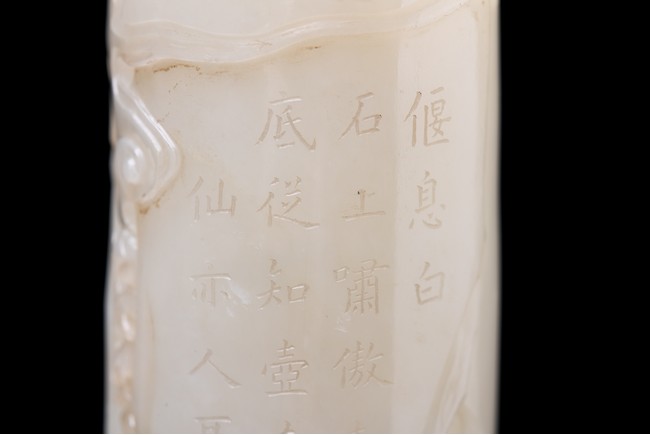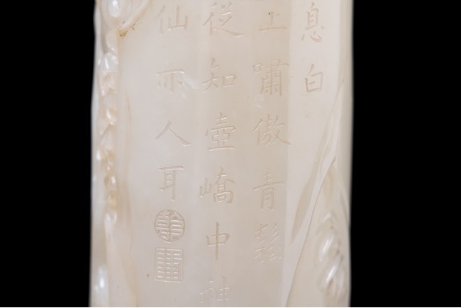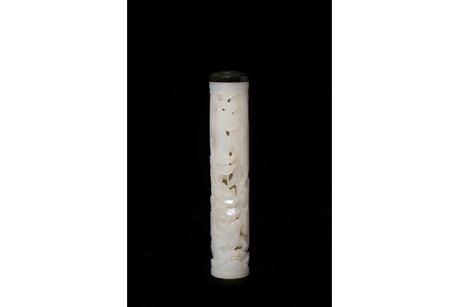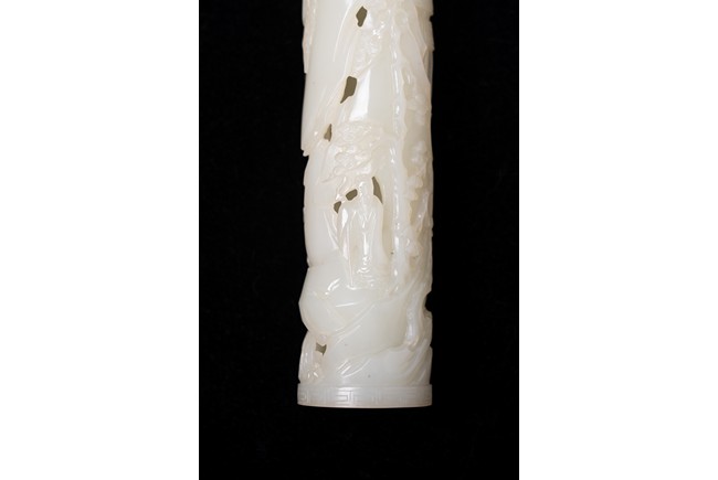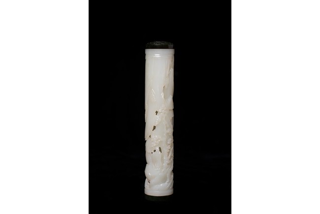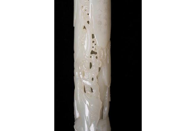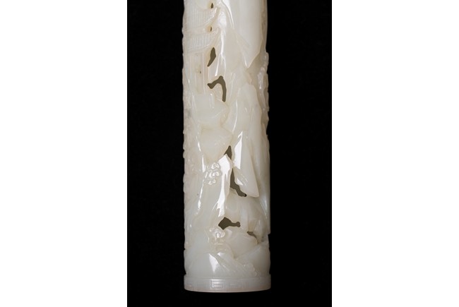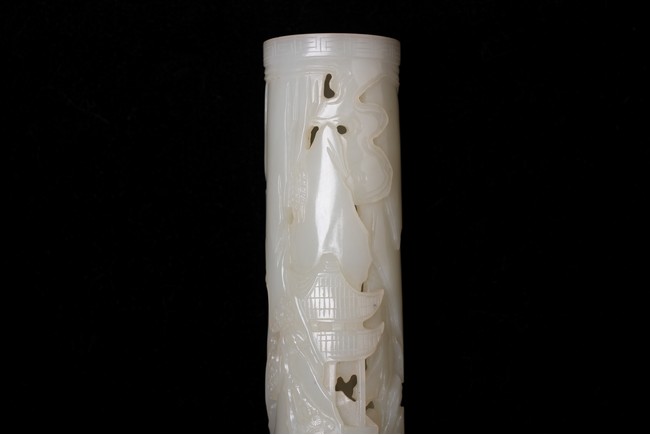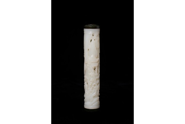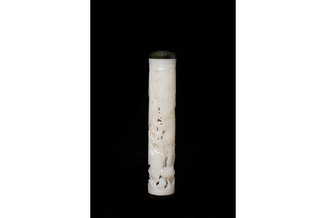 香筒是古代淨化空氣的一種室內用具,一般是直接將特製的香料或是香花放入香筒內,香氣便從筒壁、筒蓋的氣孔中溢出,是古代富貴人家必不可少的生活實用品。同時,由於香筒的製作考究,工藝精湛,又是一種清雅的室內陳設品。此件香筒以上等和田白玉製成,玉質潔白細膩,白若凝脂,呈直筒狀,圓口,香筒的上下兩端各嵌以碧玉蓋面,蓋鏤空,雕飾「花卉紋」,筒身上下口沿均勾連續回紋飾邊框,顯得莊重典雅。外壁以通景雕琢「山水人物故事圖」,巖巒逶迤,怪石嶙峋,蒼松挺立,流雲映帶,層巒疊嶂中雕欄掩映,亭臺樓閣隱約可見,懸崖絕澗,老者手持長杖,笑意盈眉,仙風道骨,童子闊額大腦,喜笑顏開。整體畫面極具層次感,施以鏤雕、圓雕、浮雕等多種雕琢技巧,以文人水墨畫的方式展開細節,以寫實的手法體現人物的姿態神情和山水樹木的氣勢神韻,構圖生動考究,繁而有序,佈局合宜,渾然一體。「偃息白石上,嘯傲青松底。從知壺嶠中,神仙亦人耳,乾隆。」御題詩文,字跡工整規矩。本品受書法及繪畫藝術影響,圖案構成傾向於寫意的山水,講究意境和佈局。制玉工匠技藝超羣,以刀代筆,白玉爲絹,刀隨心走,揮灑自如,深得山水畫寫意風流之意態,靈動幽謐,疏透玲瓏,雕工洗練,法度嚴謹,能夠相當完整地反應乾隆皇帝於玉器之審美意趣,爲乾隆時期宮廷造辦處精品。(參閱佳士得香港有限公司2010 秋季拍賣會3156 號拍品,成交價:HKD 5060000;參閱佳士得香港有限公司2021 年春季拍賣會2720 號拍品,成交價:HKD 1062500)