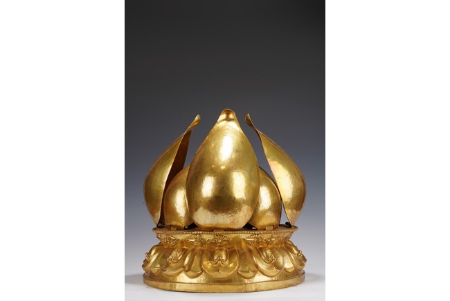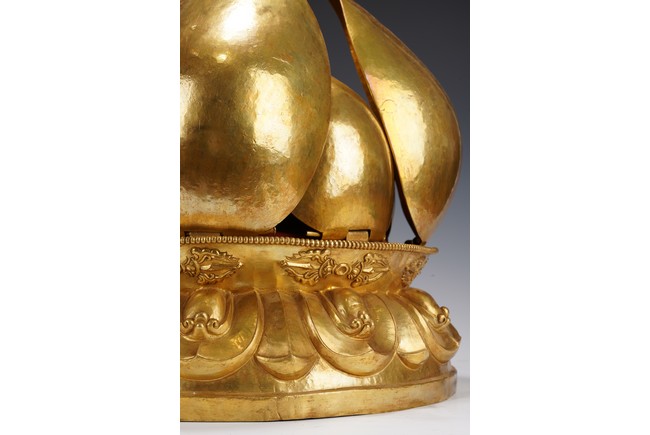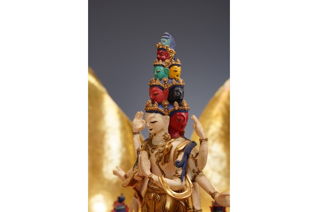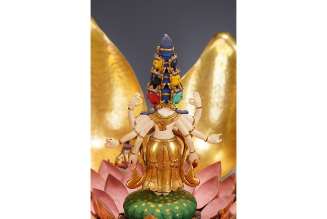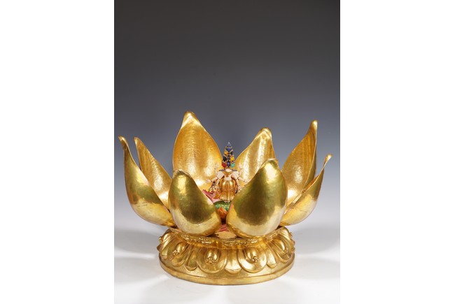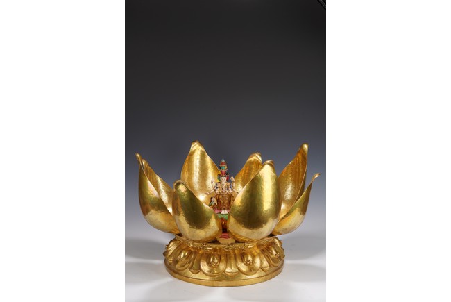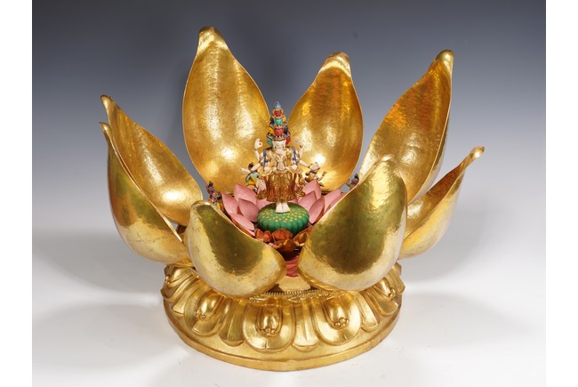 Provenance: Important private collection, Florida 藏傳佛教千變萬化的佛像造型給許多人留下了深刻的印象,此壇城外有銅鎏金八瓣蓮花,花瓣碩大鎏金厚重,花瓣內刻八寶紋飾,中間供奉八臂十一面觀音站像,彩繪色彩鮮豔,另有多尊佛像於其身側,下呈俯式蓮瓣底座,花瓣飽滿攢刻工藝精湛,氣勢磅礴,殊勝功德。 來源:佛羅里達州重要私人藏