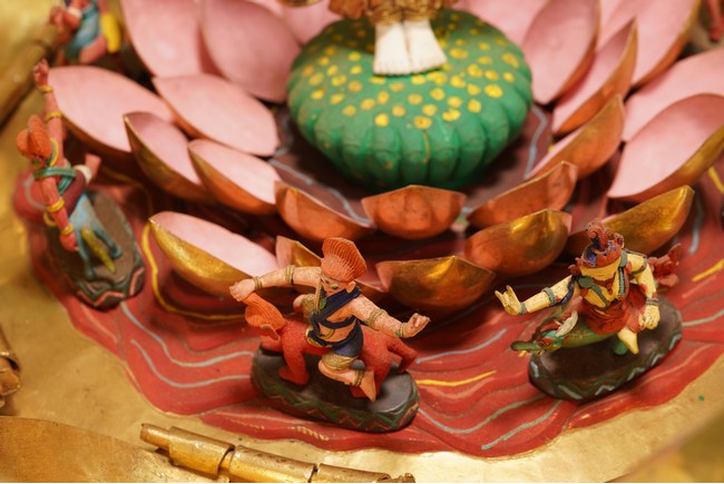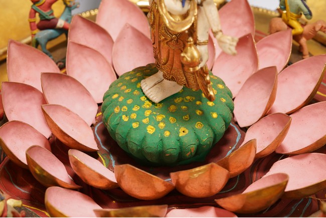 This remarkable mandala presents the six-armed Avalokitesvara within the eight-petaled lotus. When opened, at the center Avalokitesvara is shown standing upon an opening lotus bud surrounded by members of his celestial assembly. Each figure is colorfully painted. Interior of each lotus petal finely incised with the one of the eight auspicious emblems. The base further cast in relief with matching emblem to the petal. Qing Dynasty period.