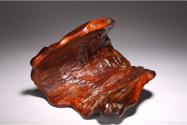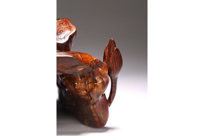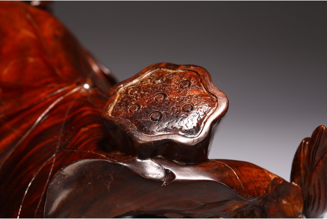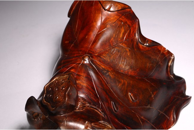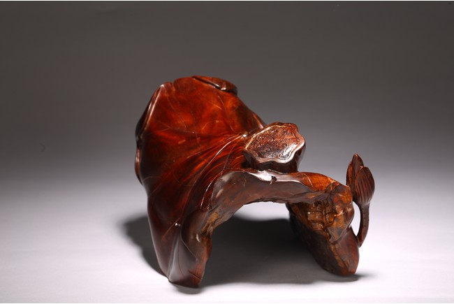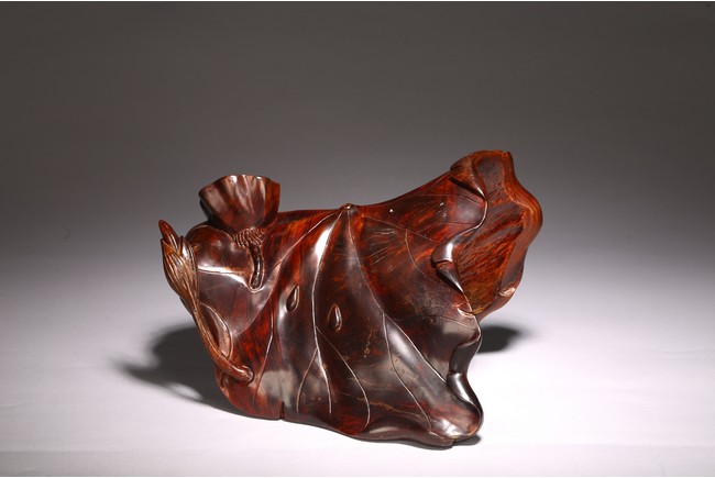 A NATURALISTIC ROOT WOOD 'LOTUS LEAF' CARVING 清 隨形酸枝木蓮花擺件