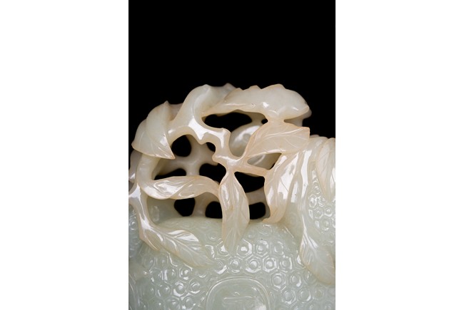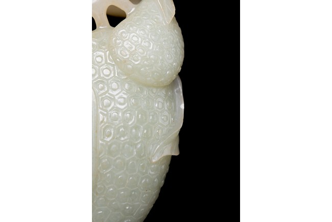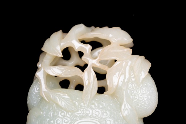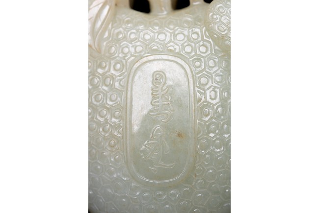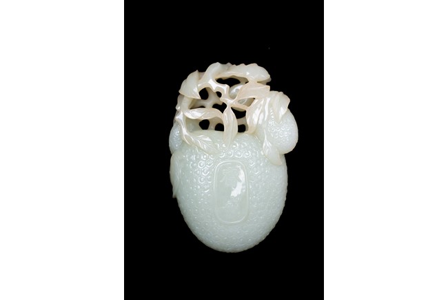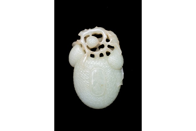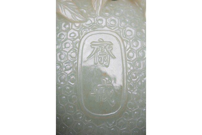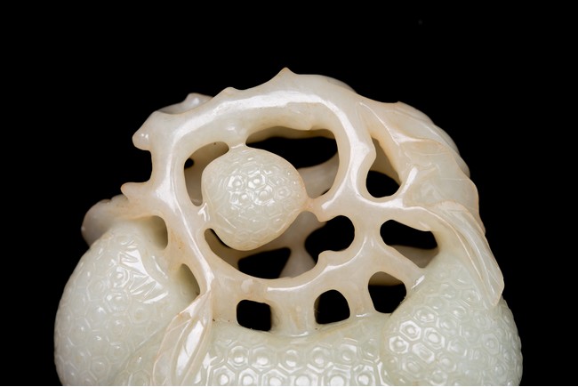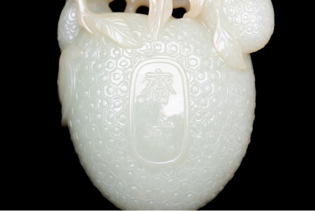 Finely worked in the form of a lychee borne on a gnarled branch issuing attendant fruits, the center incised with two characters Zhai Jie in Chinese on one side and in Manchu script the other side. Qing Dynasty period.