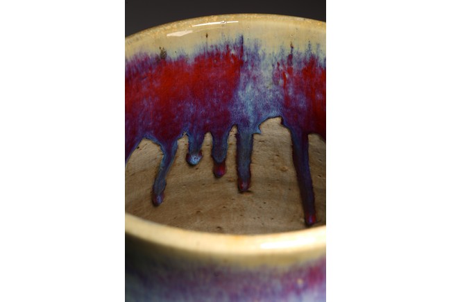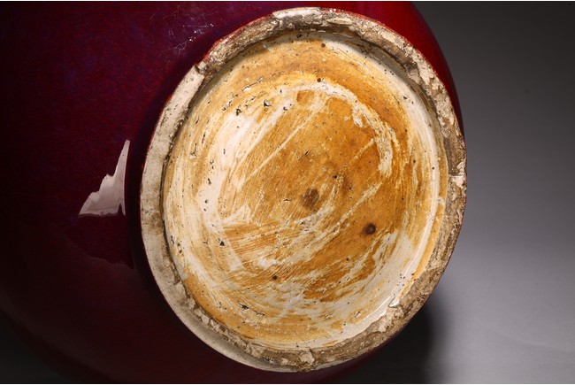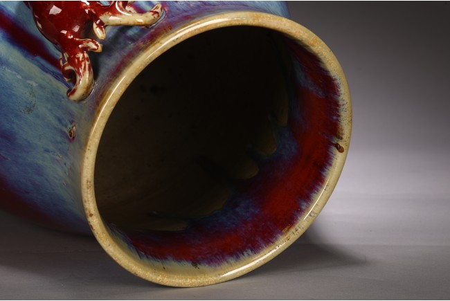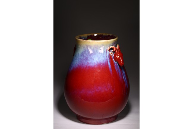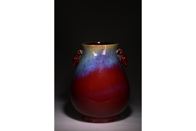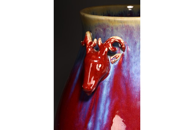 Robustly potted with a tapering ovoid body supported on a short foot, flanked by a pair of deer handles, applied overall with a rich flambé glaze of variegated crimson red and lavender-purple tones. Qing Dynasty period.