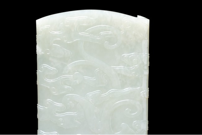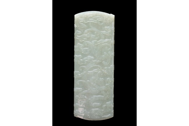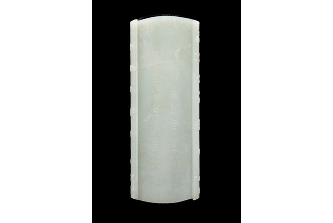Provenance: Private collection, Portland, Oregon. 臂擱是古代文人用來擱放手臂的文案用具。以免手臂衣袖剮蹭書寫的紙面,同時臂擱由於也成長條方狀,與鎮尺相類,也可充當鎮紙,壓在上面,防止紙面被風掀起。臂擱是書案重要飾物,極富書卷氣。但臂擱不是文房中的必需品,而是奢侈品。不是每位文人都備有臂擱,筆墨紙硯是書房必備用具,而臂擱可有可無,只有那些有情趣的、有經濟能力的人才會使用、收藏它,臂擱在文房用品中屬於錦上添花的東西,所以說臂擱是書房裏的奢侈品。然而玉製臂擱更爲珍罕,應爲皇室書齋御用品,此臂擱呈書卷狀,兩端如意卷首狀彎卷,以上等和田白玉製成,玉質溫潤白皙,觸如凝脂,潔白無瑕。正面雕琢螭龍自由穿梭於捲雲中,呈s 型,方臉尖耳,身形彎曲,肢體遒勁,花尾分叉,騰雲駕霧,造型流暢,極富動感。反面陰刻「御墨流香玉有輝而顏出派雲呈祥」,字跡清晰工整,老辣勁道。此物雅氣十足,無論是形、神、意、工,都讓人愛不釋手,整體刀法圓潤,雕刻細膩,打磨精緻,宮廷味十足。 來源: 俄勒岡私人藏家提供