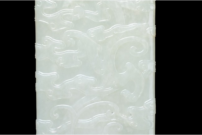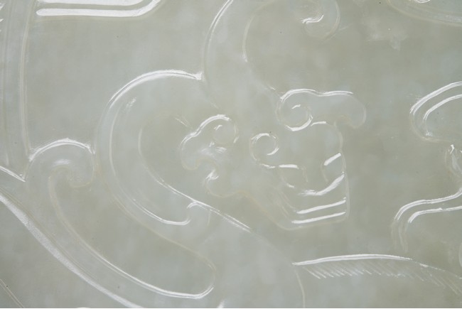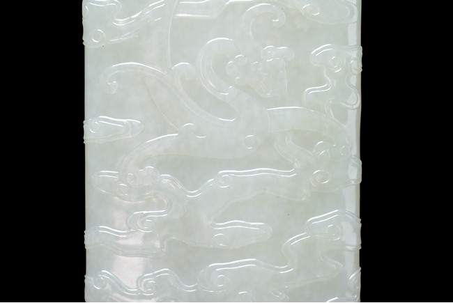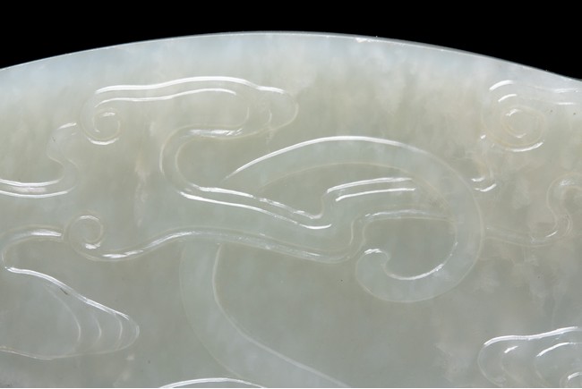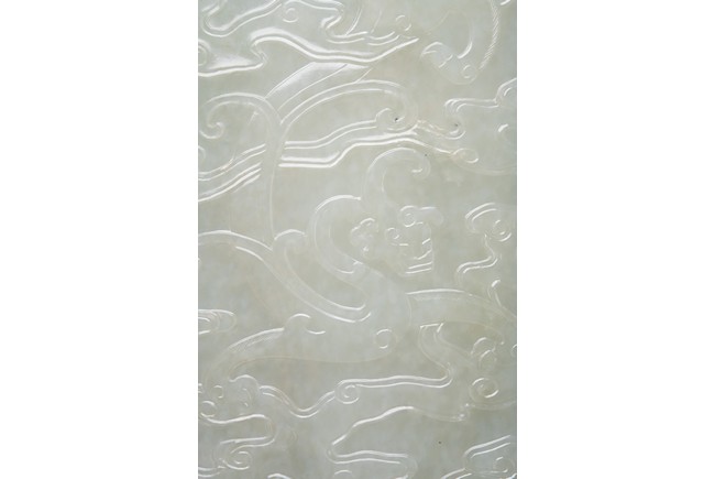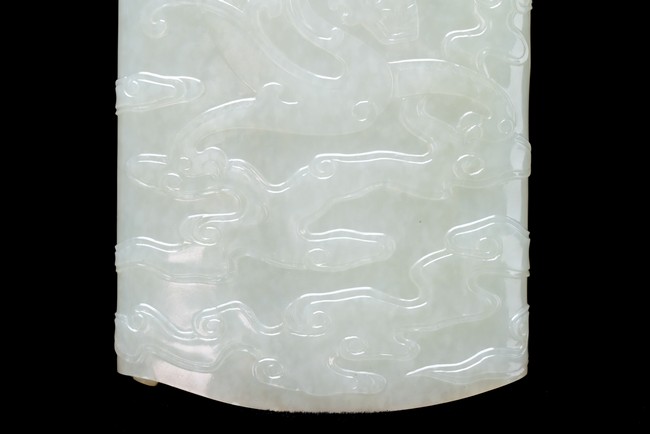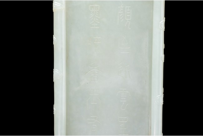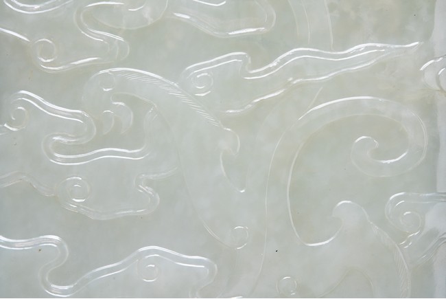 The wrist rest is carved in low relief with a sinuous chilong travelling through clouds. The other side is carved with a 12 character inscription. The stone is of smoothly polished white tone. Qing Dynasty period.