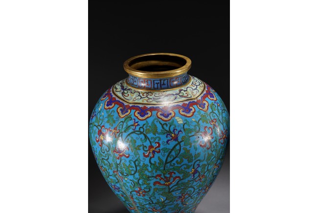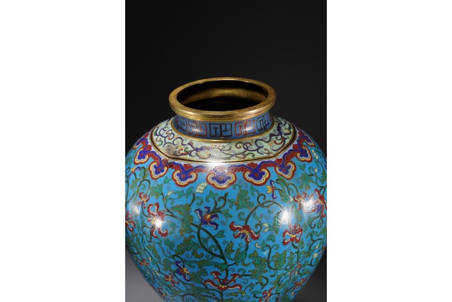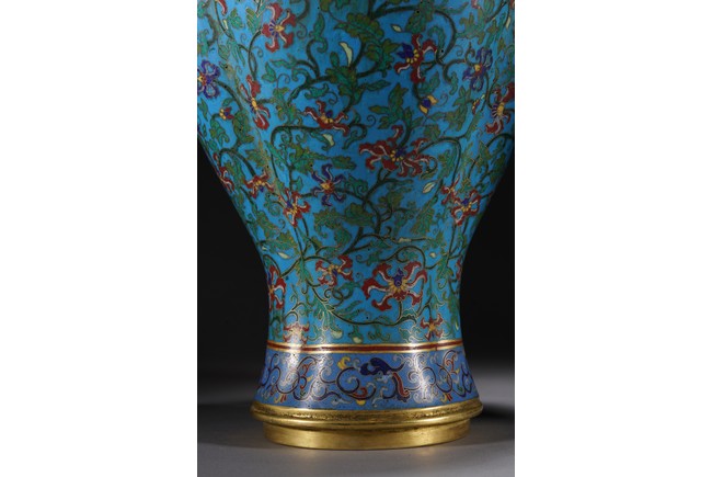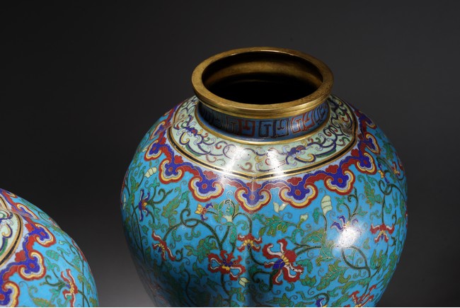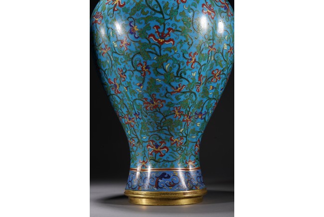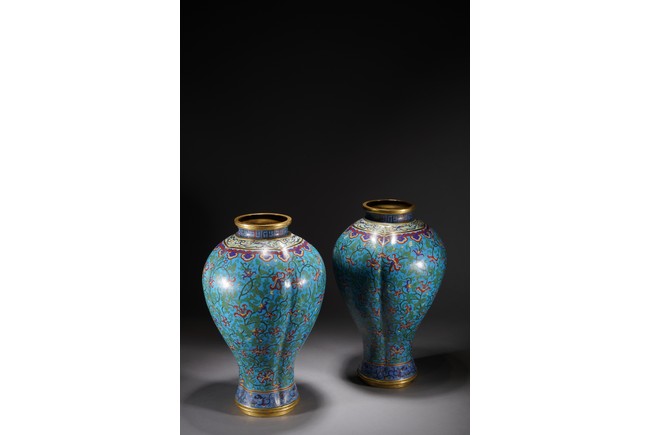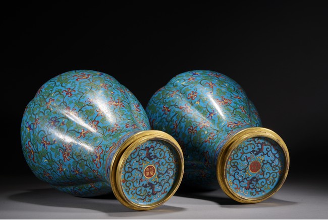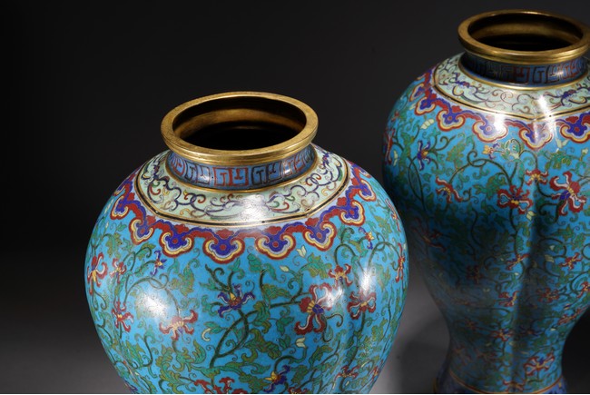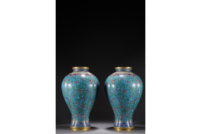 梅瓶六棱圓形,銅胎掐絲琺瑯鎏金材質,金水厚重,髮色靚麗,周身琺瑯藍地,以紅綠黃白填色,呈現纏枝蓮寶相花紋飾,掐絲細密精緻,底款為乾隆年制四字楷書款,整體造型端莊俊美,成對保存完整非常難得。