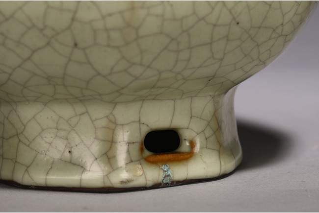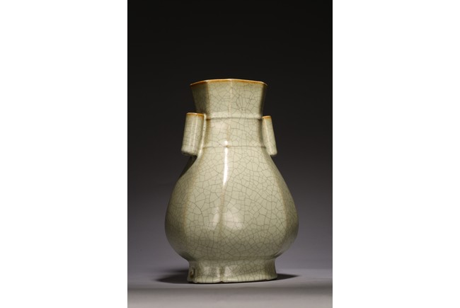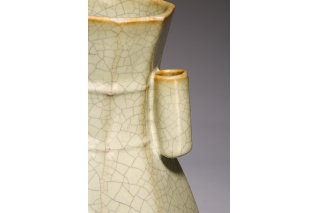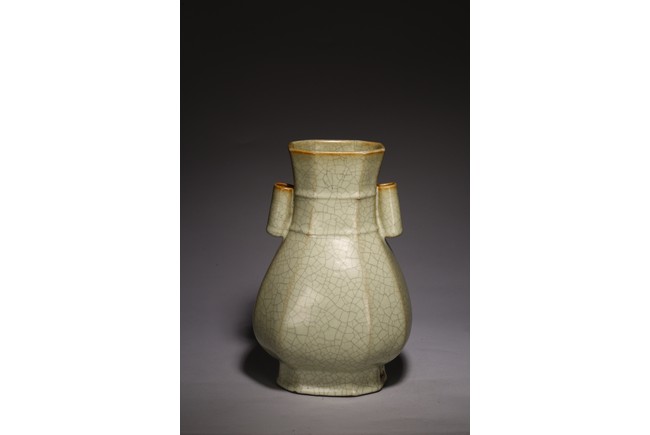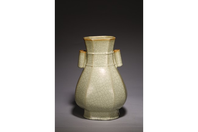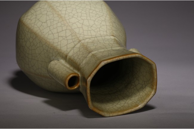 The vase is made in imitation of Song dynasty Ge ware with a faceted body, a pair of lug handles, and is covered overall with a glaze of pale bluish-grey color suffused with dark grey crackle, the unglazed bottom of the foot is covered with a brown dressing. Qing Dynasty period.