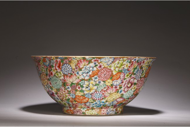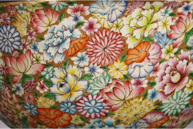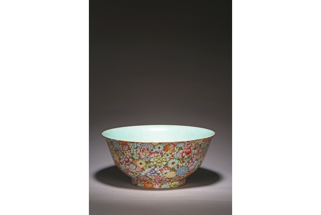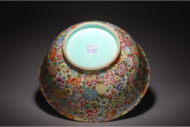 The deep sides rising to a gently flaring rim, the exterior finely enamelled with a dense profusion of flowers all reserved on a gilt ground, interior covered with turquoise green, base inscribed with six character mark. Qing Dynasty period.