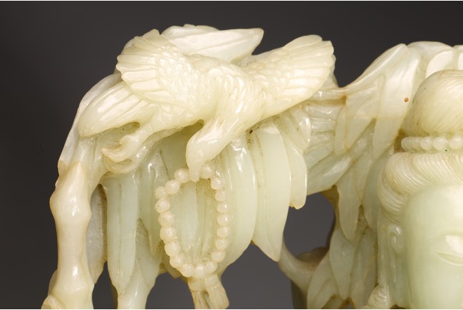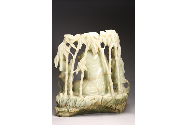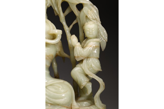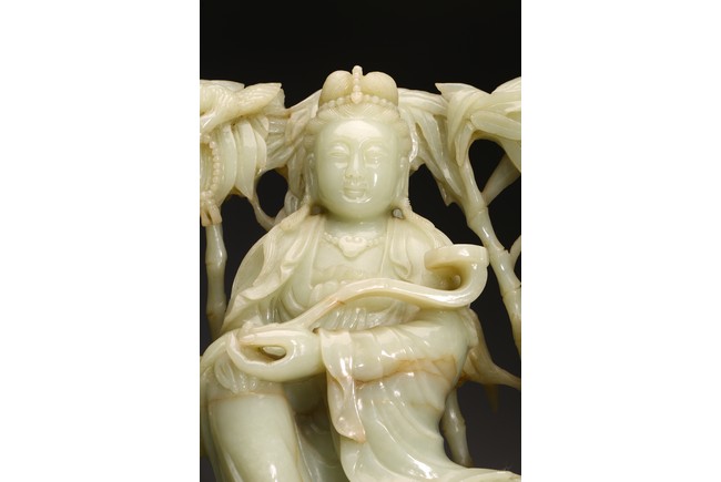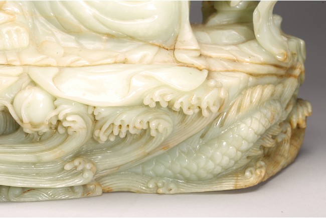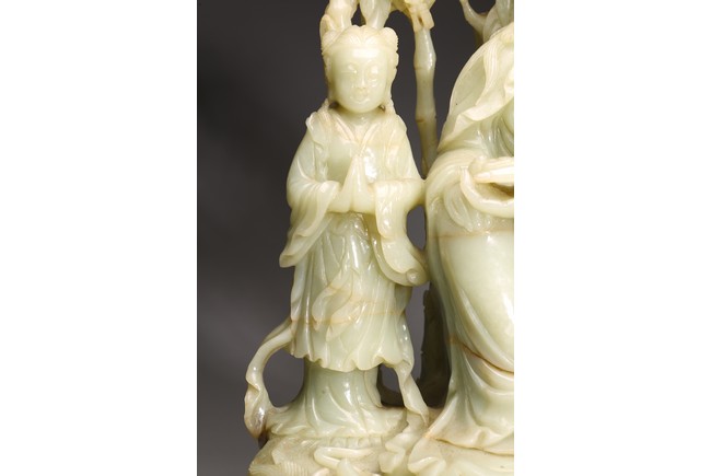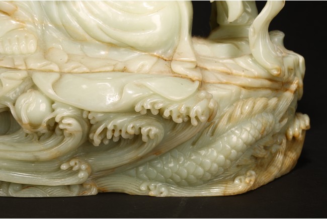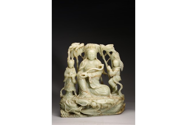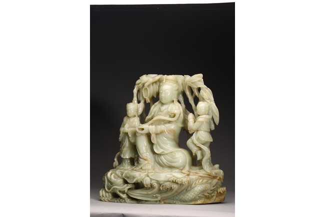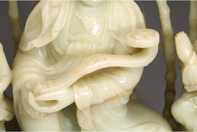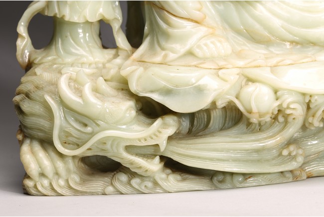 Deftly carved in the form of seated Guanyin holding ruyi scepter, dressed in long flowing robes, face with benevolent expression framed by chignon, flanked by two standing boys, backed by carved bamboo woods, all supported on a large dragon issuing cresting waves, the stone is of polished pale celadon tone.