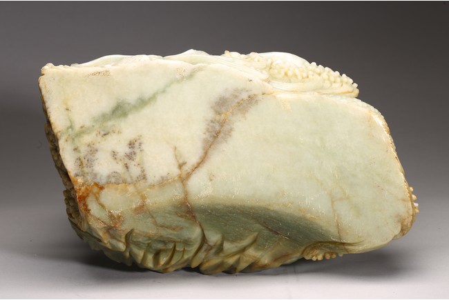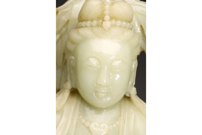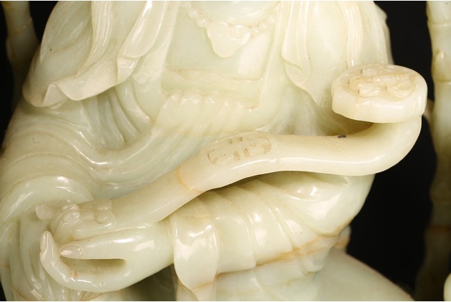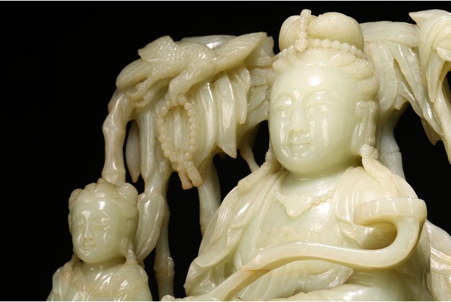 和田玉持如意觀音坐像精心雕就,玉質細膩如凝脂,質地上乘,細緻溫潤,用料碩大,觀音開臉飽滿,法相端嚴,束髮髻,神態慈祥,五官刻畫細膩,彎眉長目,身着天衣,衣紋處理流暢自然,雙手持如意,呈自在坐姿於海水座之上,兩側童子呈拜觀音姿勢,活靈活現,整器紋飾精美細膩,刀法流利而精湛,極富表現力,展現匠人之高超技藝,極具收藏價值。