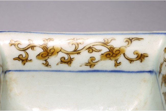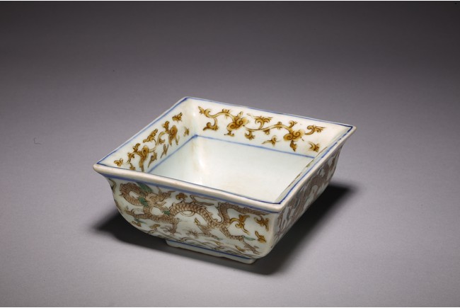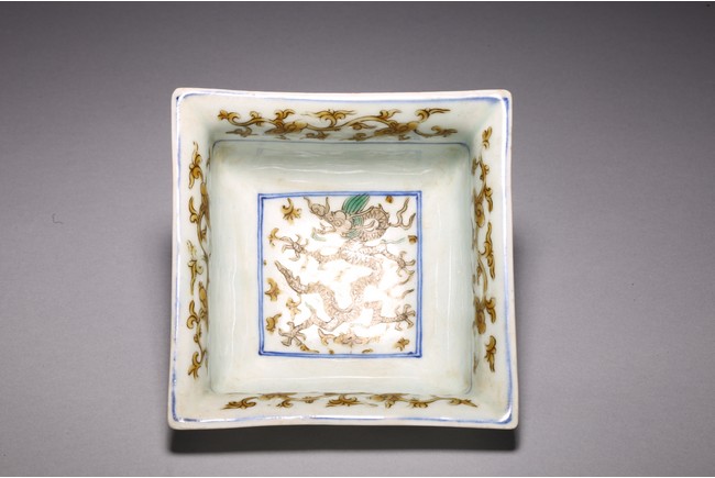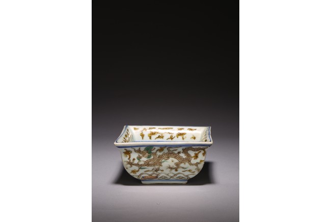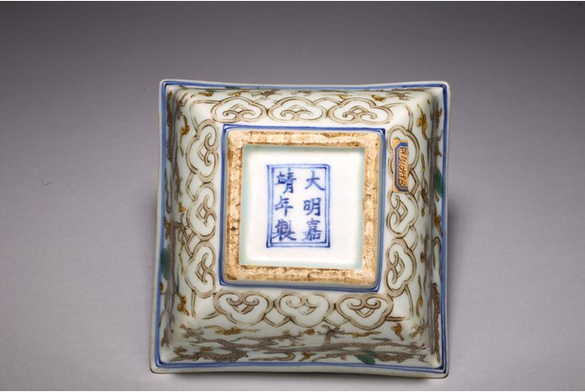 Of square section, the slightly rounded flaring sides rising from a short tapering foot to an everted rim, painted to each side with a phoenix soaring amidst floral sprays, the interior decorated with a dragon within a double square to the centre, the base with a six-character Jiajing mark in underglaze blue. Ming Dynasty Jiajing mark.