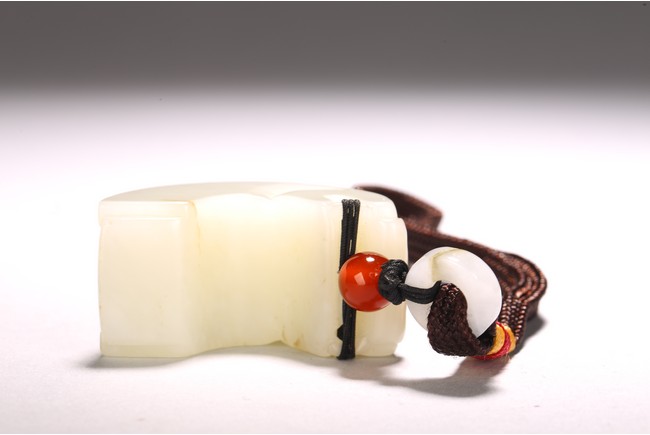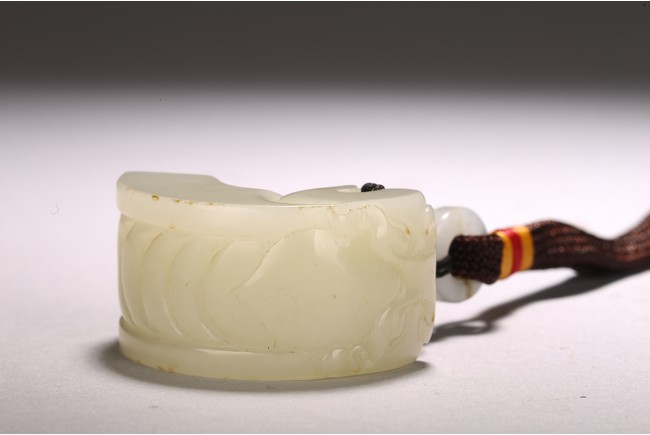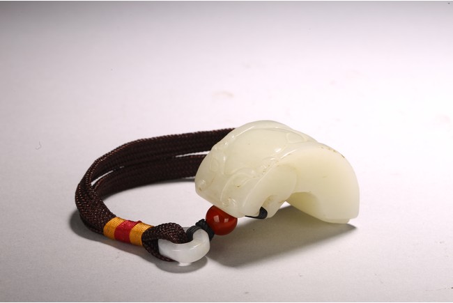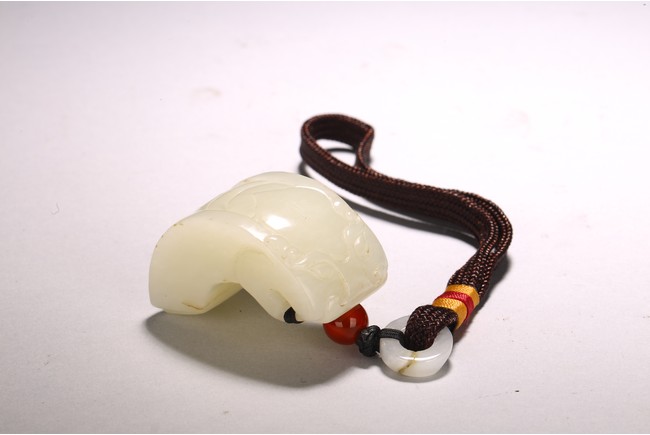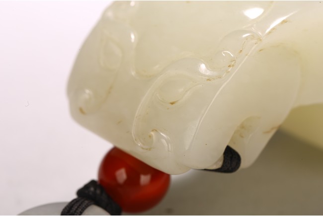 The pendant carved in the form of an arch, with one end as mythical beast head with mouth open forming the a hole.