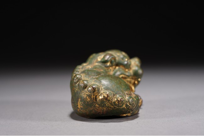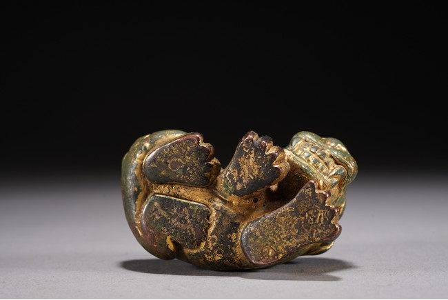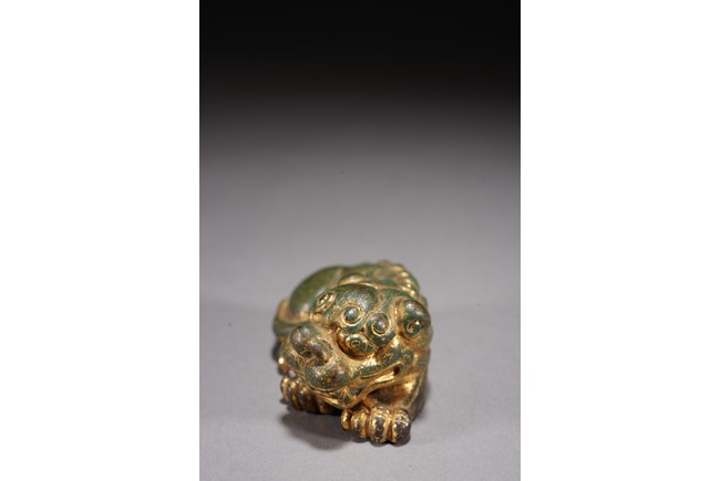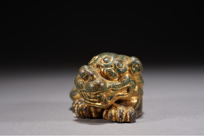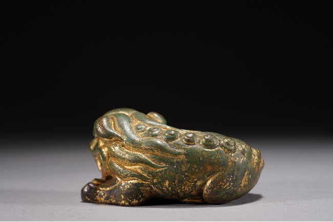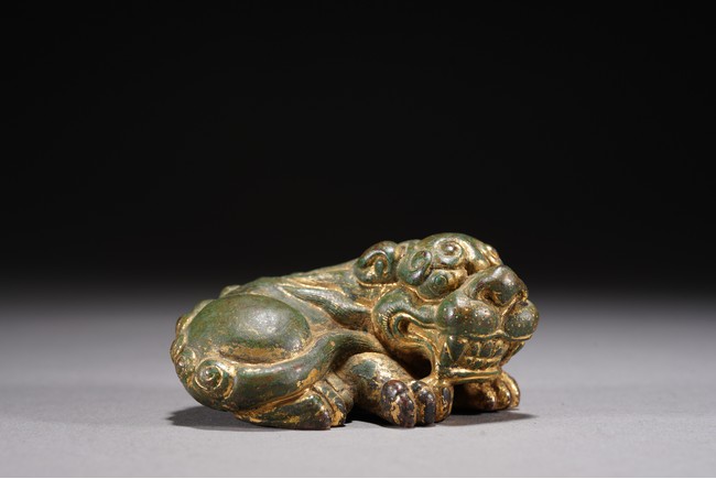 Provenance: From a private New York City collection 此瑞獸為精銅所鑄,通體鎏金,腿部及腹部經長期摩挲,斑駁中凸顯歷史之滄桑。瑞獸整體造型乖巧可愛,比例協調,作匍匐狀,雙目圓睜,炯炯有神,鼻孔放大,虎牙外露,雙爪鋒利,神態憨厚而不失威嚴,甚惹人喜愛。此類銅鎏金器物常作為紙鎮或擺件,置於案頭,有“避邪迎祥”之意。 來源:紐約市重要私人藏家提供