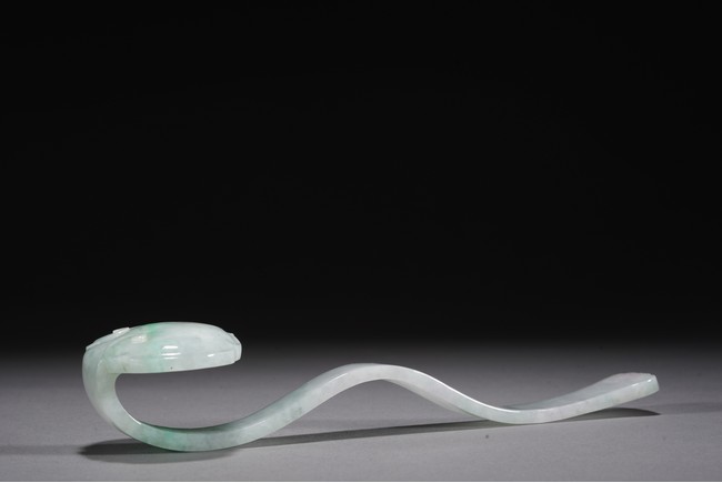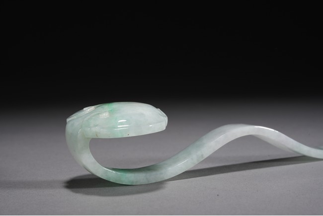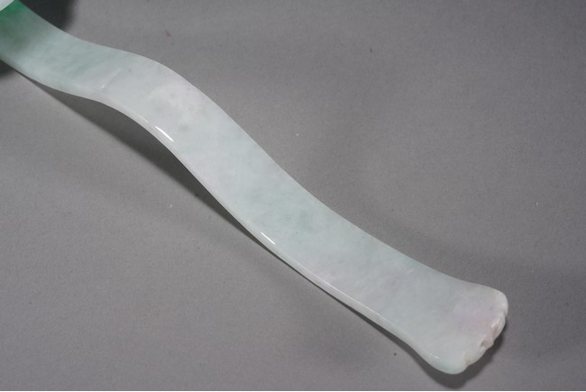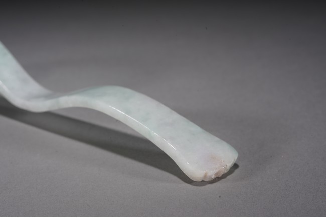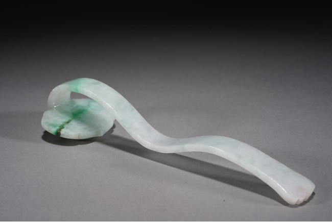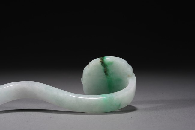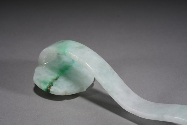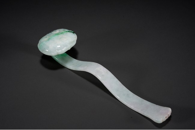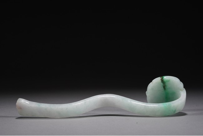 The ruyi scepter with elongated shaft and ruyi shaped head, the stone is polished translucent white tone with apple green inclusions. Qing Dynasty period.