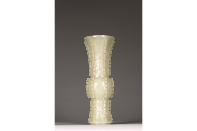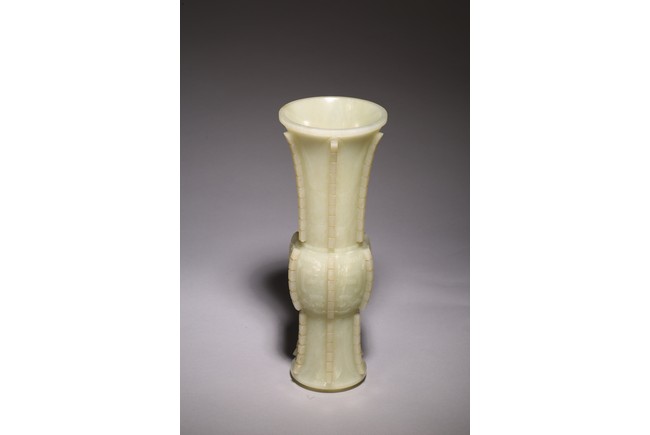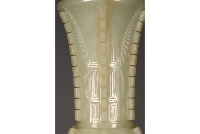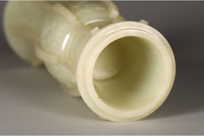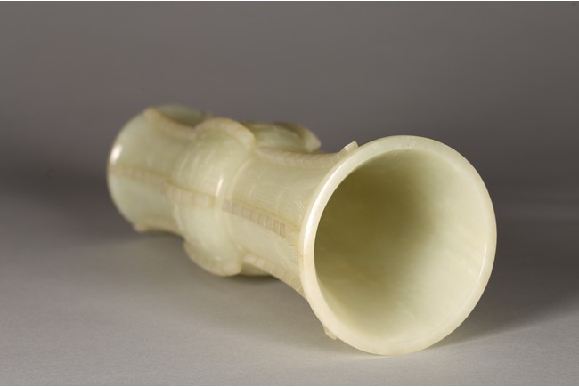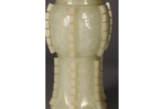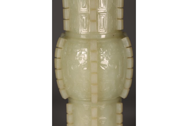 Chinese. Of round section, the central bulb carved with taotie masks and set between a spreading base and flaring trumpet mouth both patterned with stylized cicada lappets, divided by a vertical flange. Qing Dynasty period.